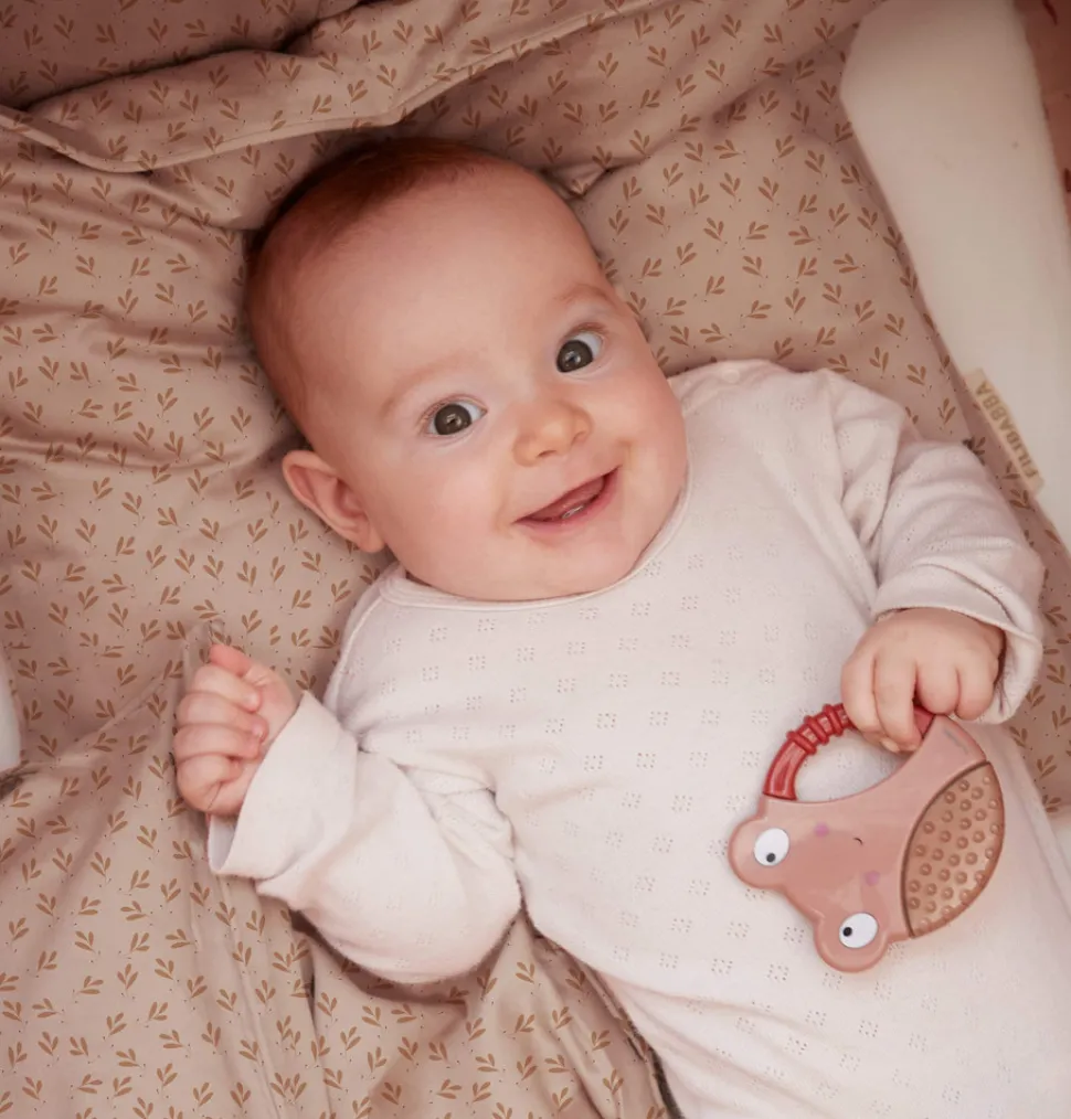Hjælp din baby med Filibabba søde kølebideringe i diskrete farver. Kølebideringen er fyldt med sterilt vand og lindrer dit barns ømme gummer ved tandfrembrud. Det lille håndtag med struktur gør det nemt for barnet at gribe om ringen. Bideringene er designet med spændende strukturer og former, som stimulerer dit barns mund og hænder. Bideringene har en rolig klokkelyd, hvorfor de også fungerer som rangler.