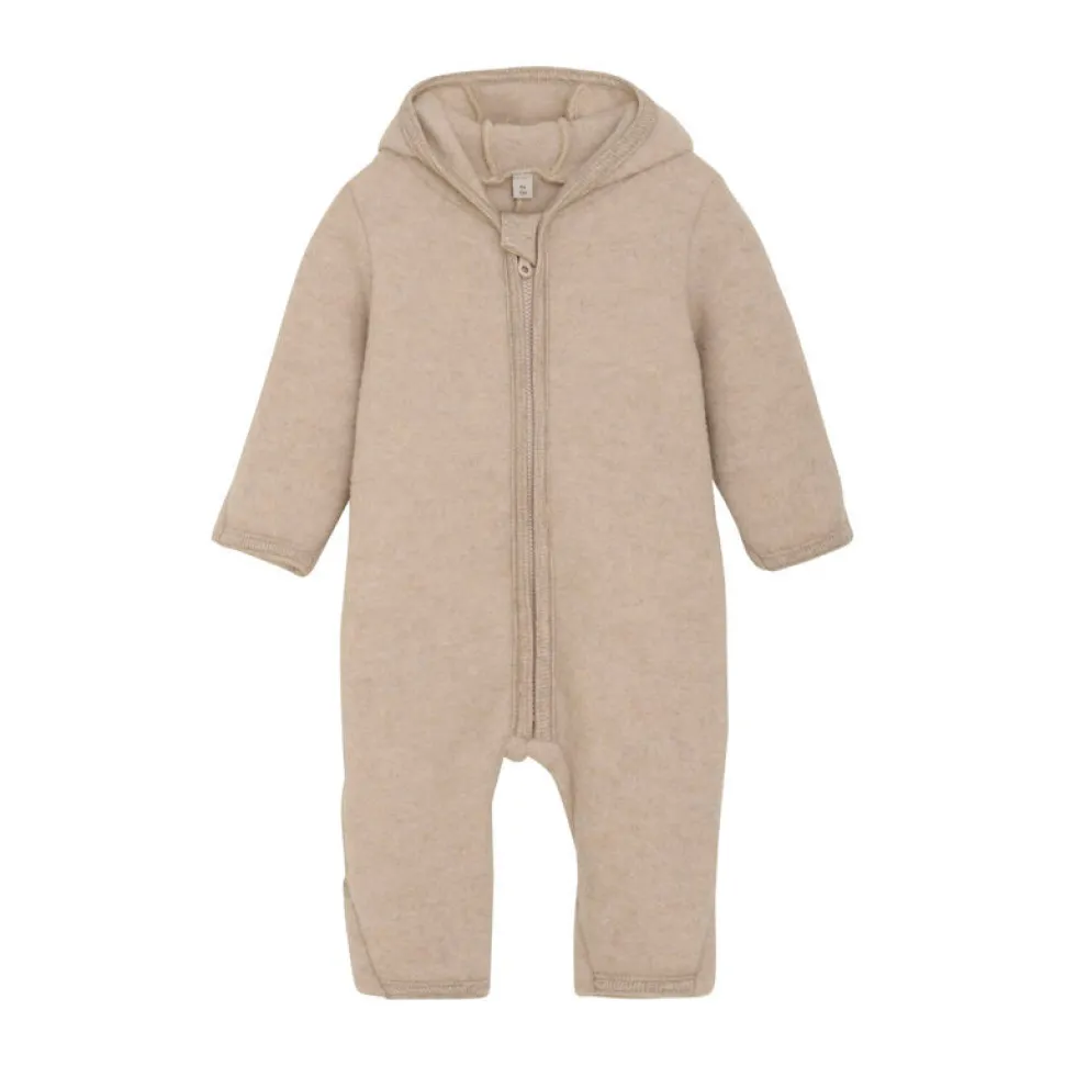 Smart varm Huttelihut køredragt i uldfleece. Huttelihut køredragten har en fast hætte med en rund hovedform og små søde øre på toppen. Køredragten har lange ærmer og ben med praktiske ombuk, Til at holde små fødder og hænder varme. I alle åbninger er der ribkanter. Køredragten åbnes fortil med en skjult lynlås med hagebeskytter. Dragten er lavet i Merino uld.