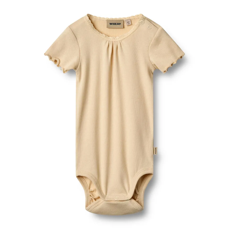 Wheat’s body’en er unisex og et sandt essentielt stykke tøj i din babys garderobe, da den enten kan bæres alene eller som et ekstra lag under hverdagsklædningen. Bodyerne har enten trykknapper på skulderen eller knapper i halsen for bedre komfort, når du klæder din baby på. Body’en har også trykknapper forneden, hvilket gør det nemmere for dig at skifte din babys ble.
