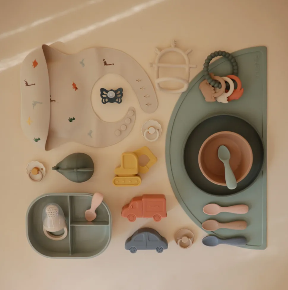 Mushie Toddler Starter Spoons – Silicone 2-Pack – Cambridge Blue/Shifting Sand