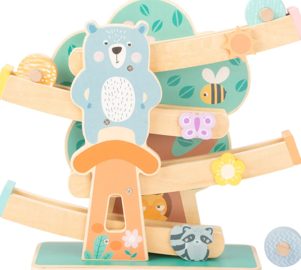Er det tid til en hurtig tur gennem skoven? På denne robuste marmorbane i trendy pastelfarver kører tre farvede træhjul dekoreret med moderne mønstre ned ad en bane dekoreret med beboere i skoven. Langvarig legetid er forprogrammeret her! Et rigtigt blikfang og et attraktionspunkt for enhver børnehave! Særligt robust med den brede base!