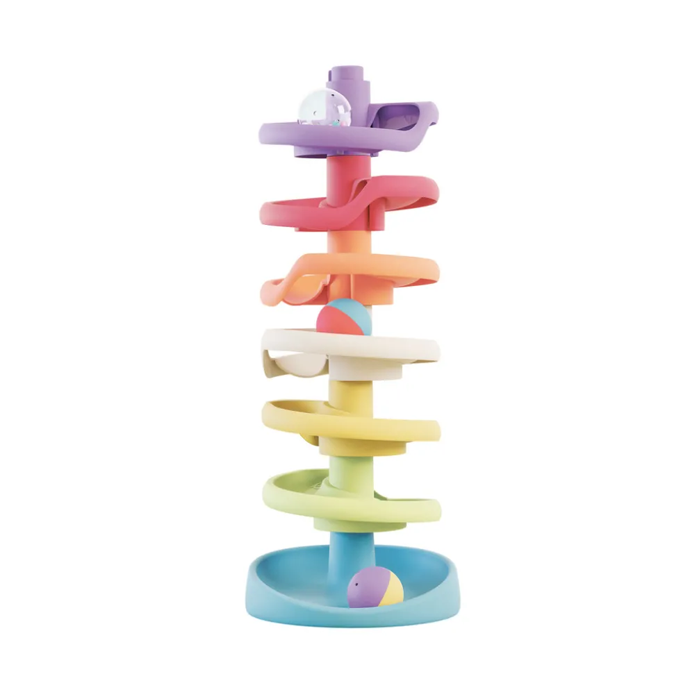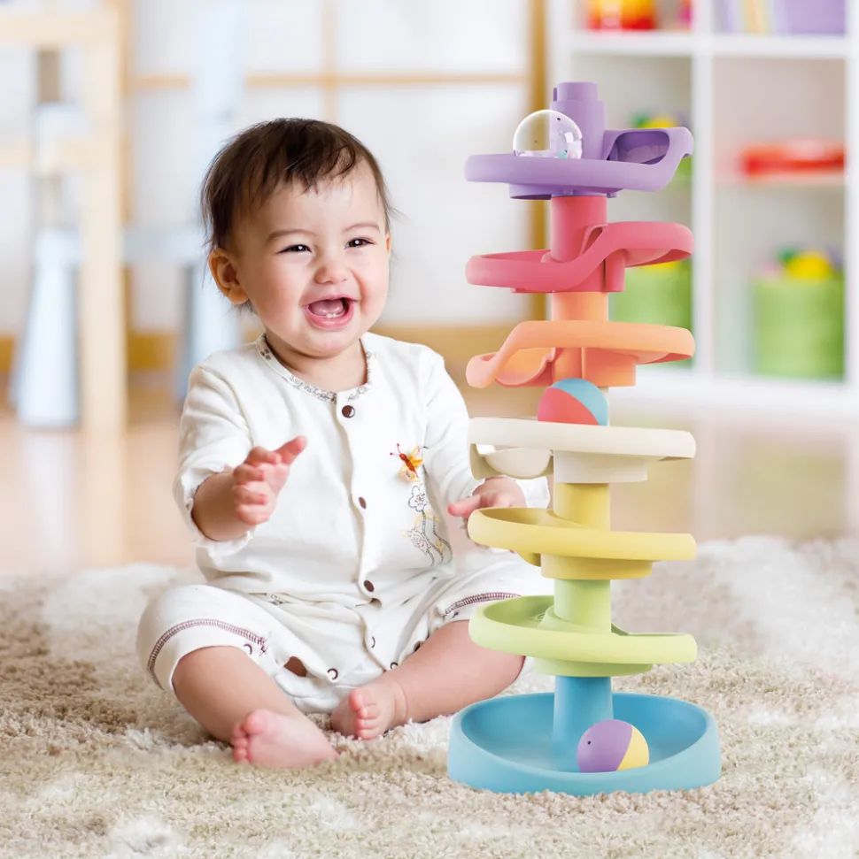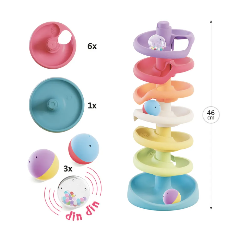 Dette flotte legetøj træner dit barns finmotorik ved at bygge tårnet, gribe om og slippe kuglerne samt forståelsen af årsag og virkning ved at se kuglerne trille ned ad den sjove bane.