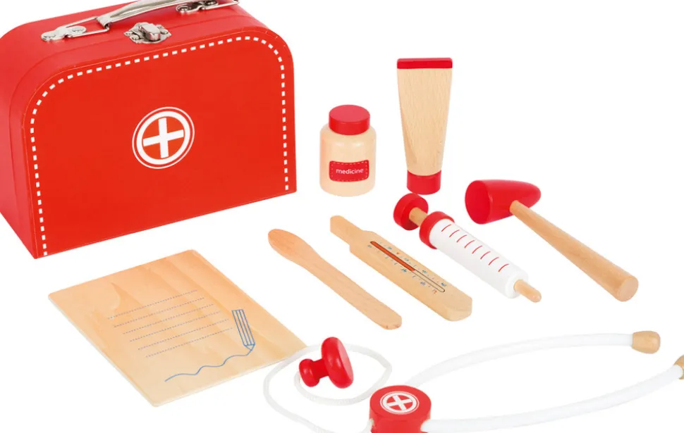 Lægesæt med stetoskop, journal, salve og meget mere.