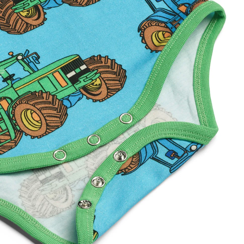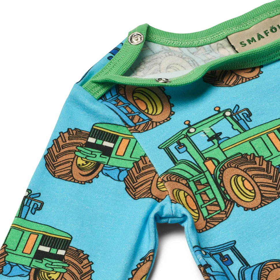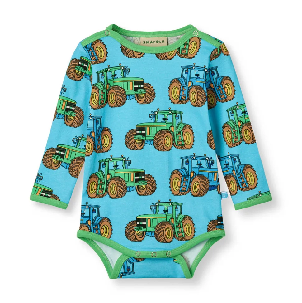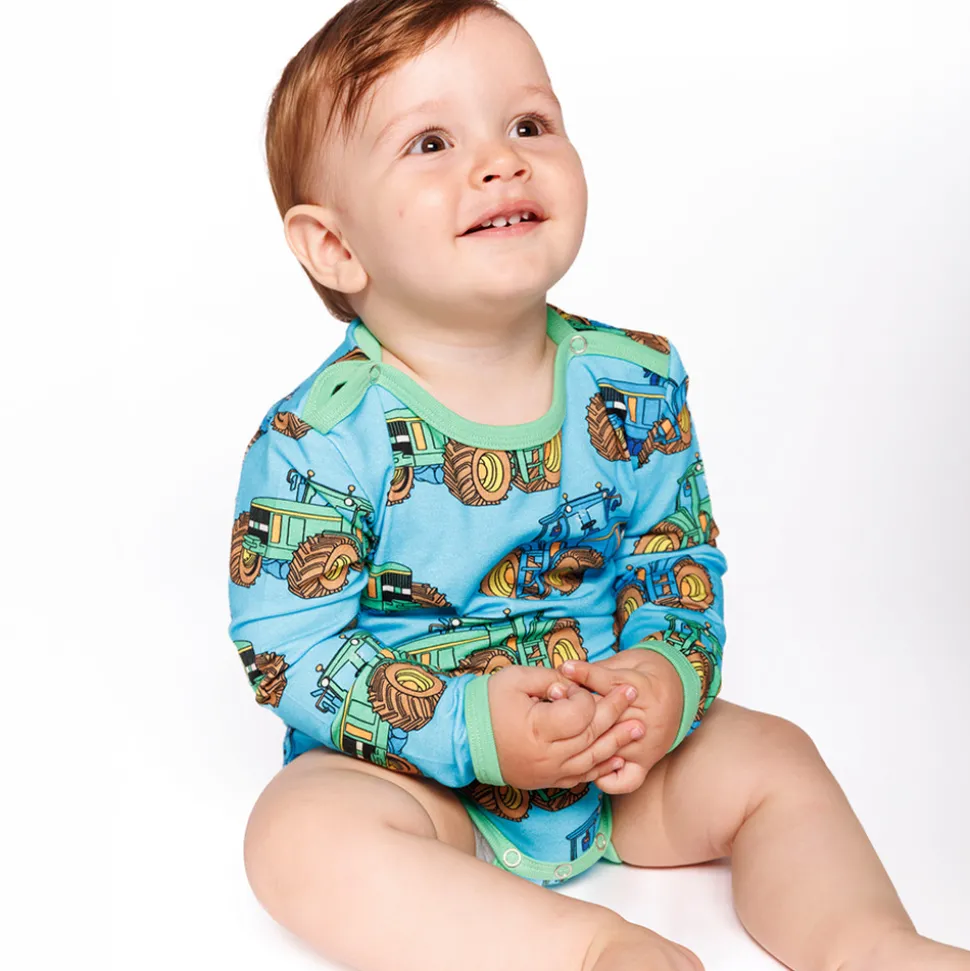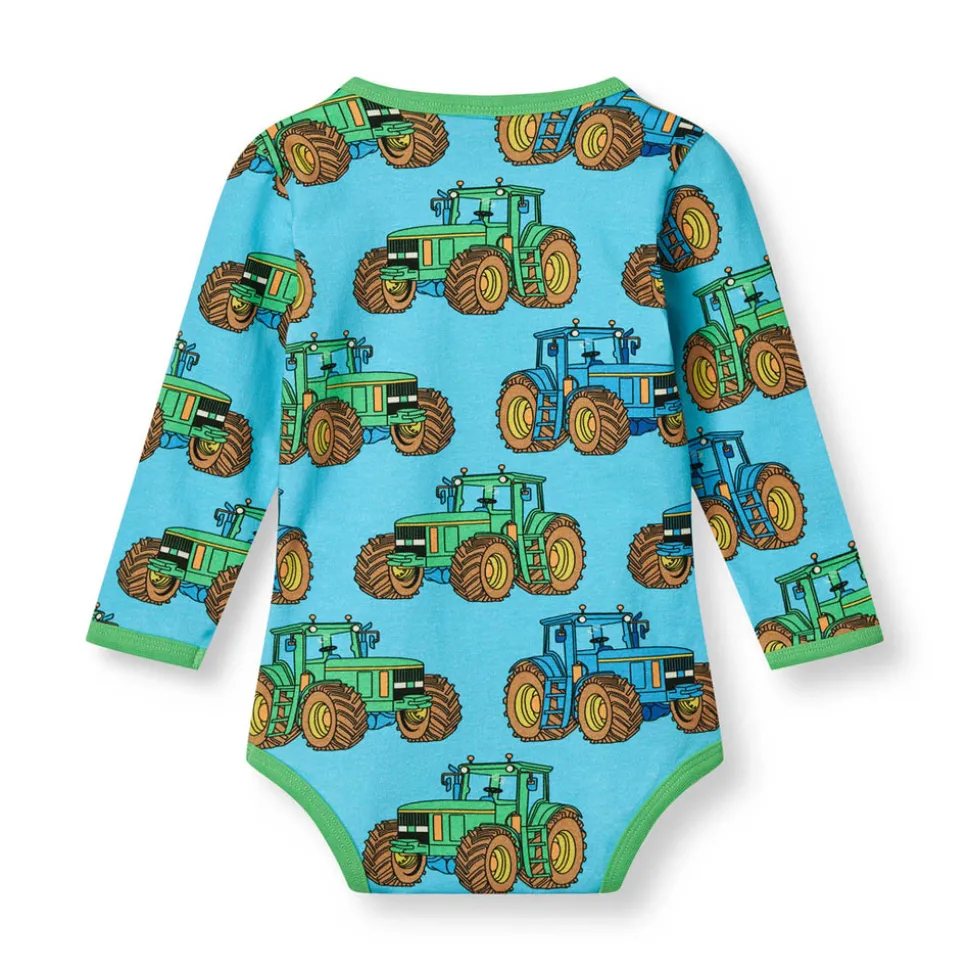 Langærmet baby body med traktorer produceret i en økologisk og strækbar bomuldsjersey. Denne body har en normal pasform med kuvertlukning og trykknapper, samt ribkant i hals og ærmer.