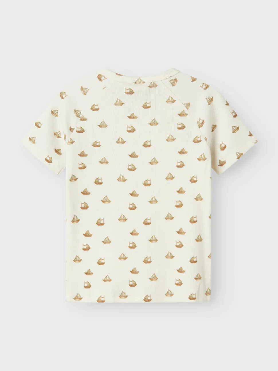 Giv din garderobe et maritimt touch med vores t-shirt med bådprint. Ideel til sommerdage, denne t-shirt kombinerer komfort og stil for et afslappet og trendy look.