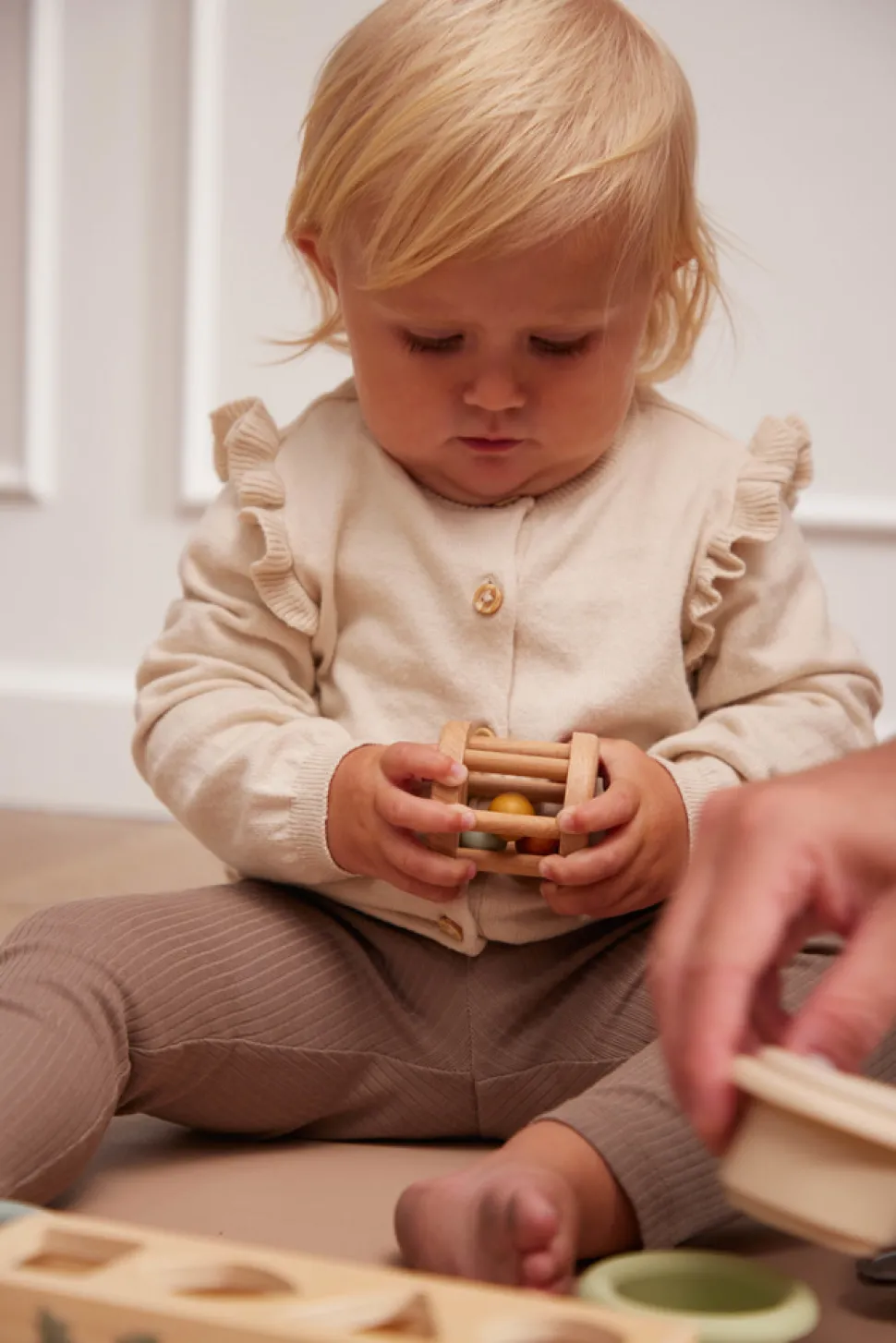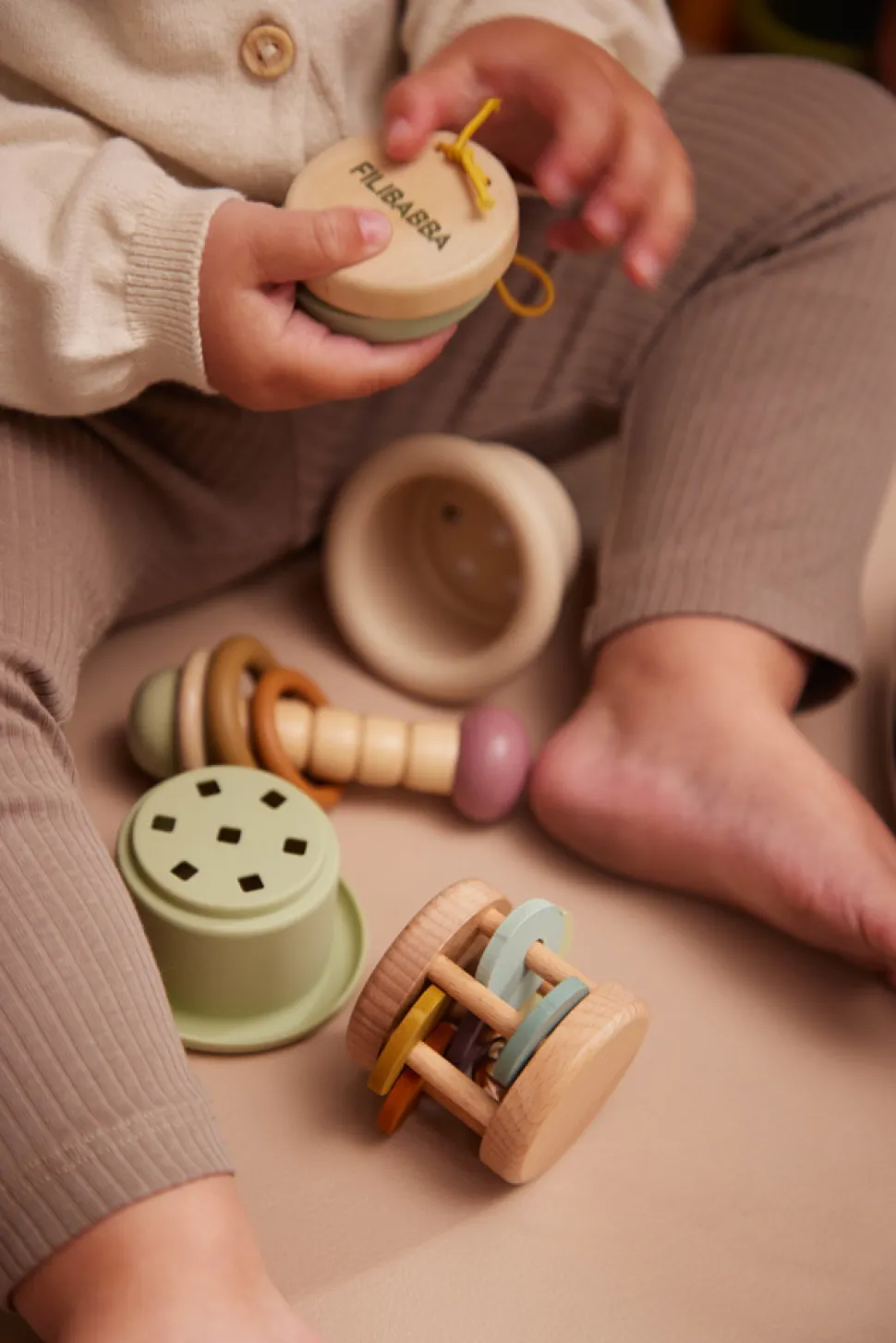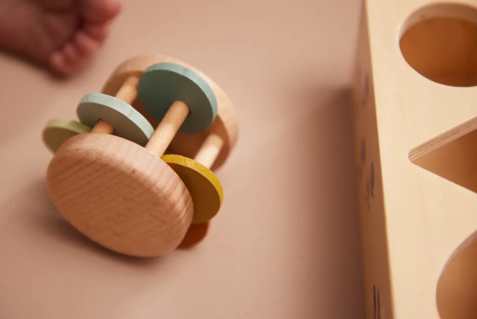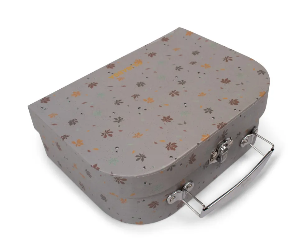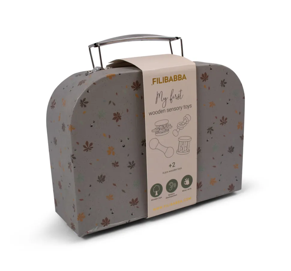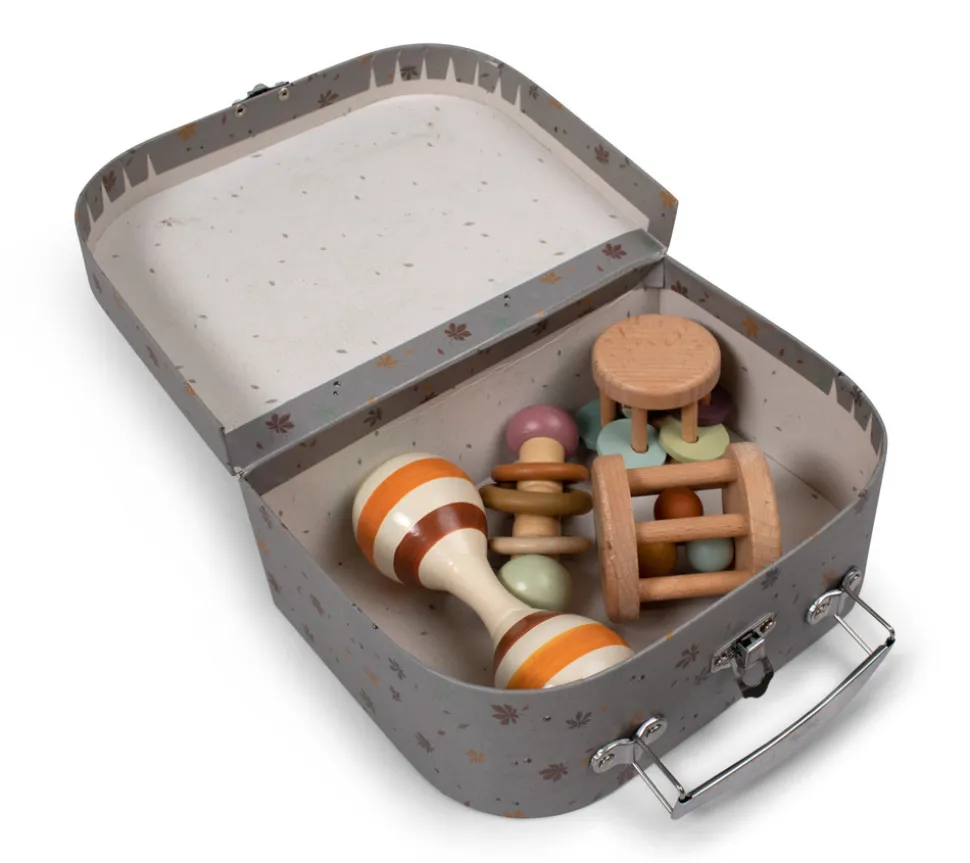 Med denne fine legekuffert med sanselegetøj kan barnet udforske lyde, farver og spændende overflader. Kufferten indeholder 4 stk. sanselegetøj i bøgetræ. Ydersiden af kufferten er udsmykket med det fine print Chestnuts med farverige kastanjeblade. Legetøjet har bl.a. klokke- og ranglelyde og masser af fine farver, der helt sikkert vil fange barnets opmærksomhed. Med den praktiske kuffert kan sættet nemt tages med på tur og hurtigt ryddes pænt af vejen, når legen er slut. Hele sættet er grundigt testet og godkendt efter den europæiske sikkerhedsstandard EN71 og bærer CE-mærket.