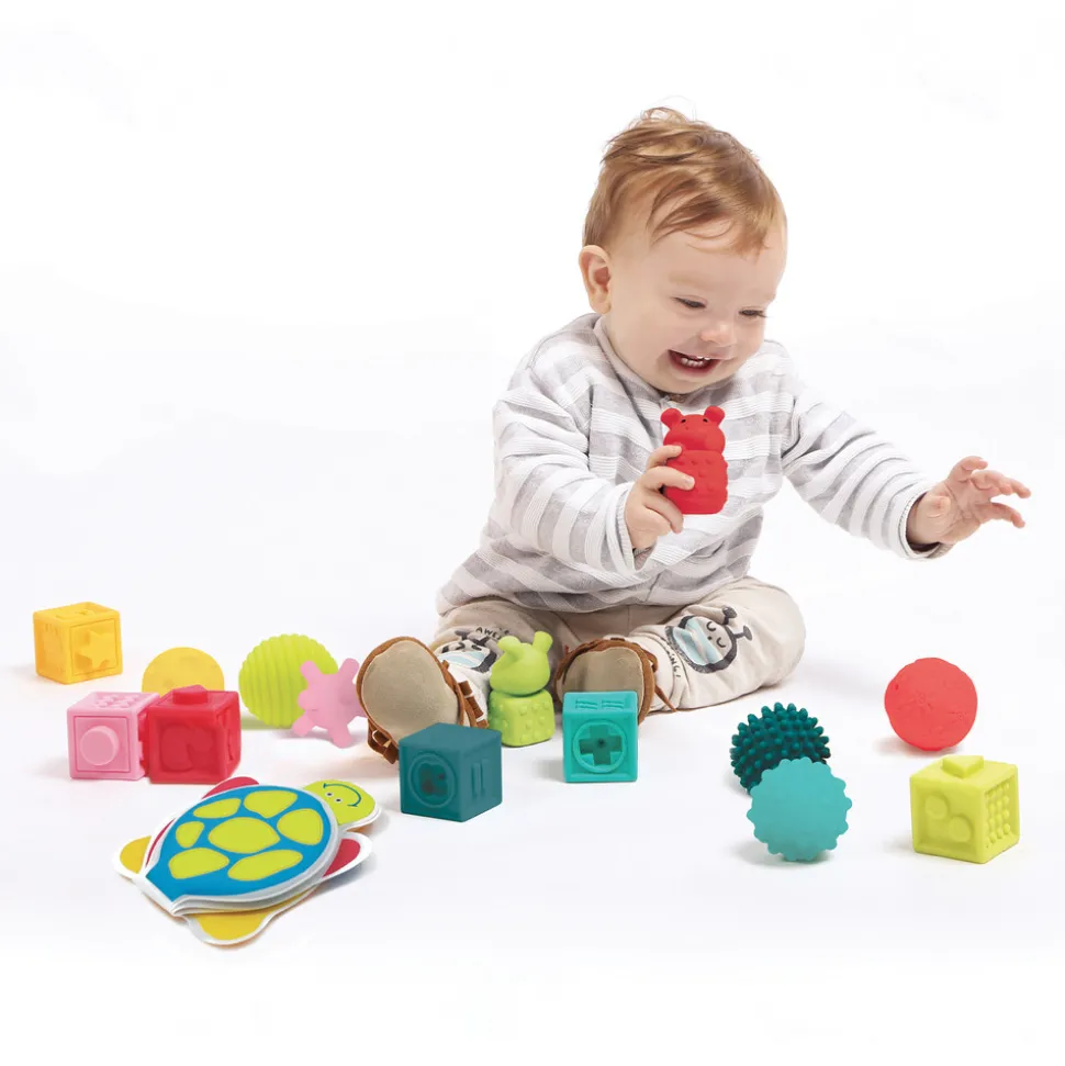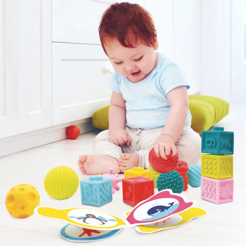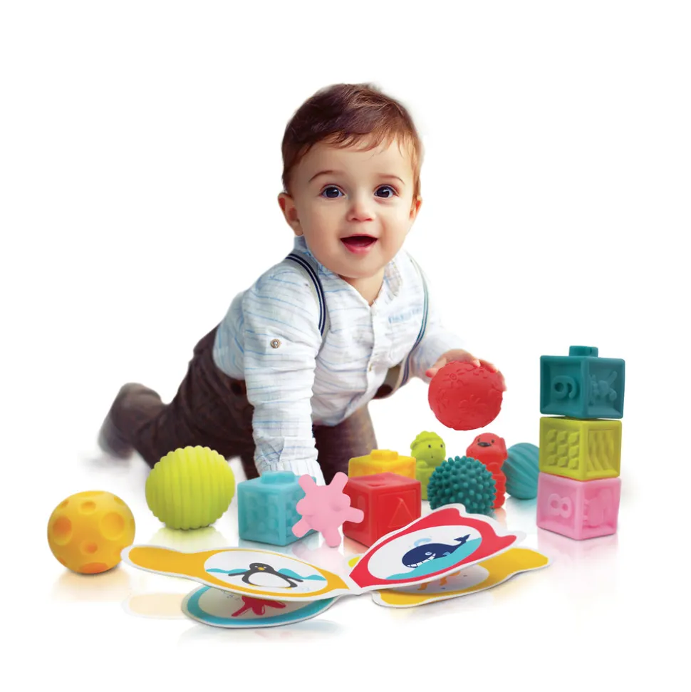 Med dette sæt er der flere forskellige muligheder for sjov leg. Alle dele er i forskellige farver, og boldene og klodserne har forskellige overflader, som er sjove for barnet at udforske. Bogen er fyldt med farverige billeder, så man sammen med barnet kan kigge på og snakke om.