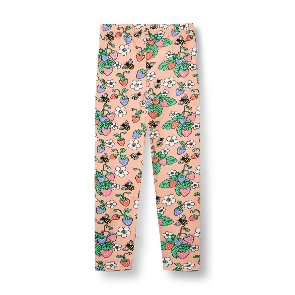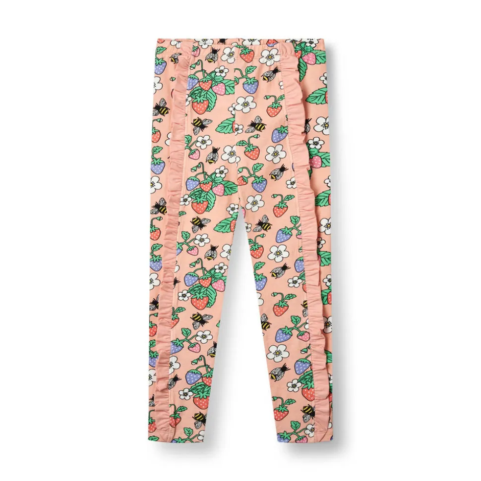 Leggings med jordbær, produceret i en økologisk og strækbar bomuldsjersey. Småfolks leggings har en normal pasform med elastik i taljen. Disse leggings har en sød flæsedetalje ned langs benene.