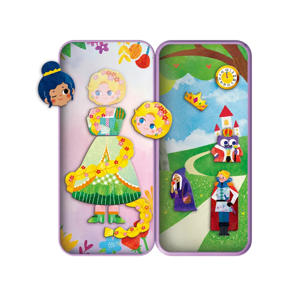 Dette magnetiske legesæt med eventyr-tema indeholder to baggrunde og mere end 30 magnetiske brikker til at sammensætte sin egen figur og finde på sjove historier.