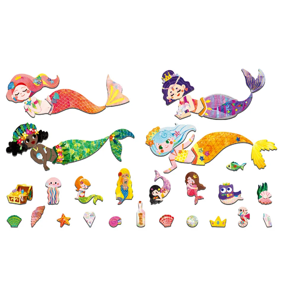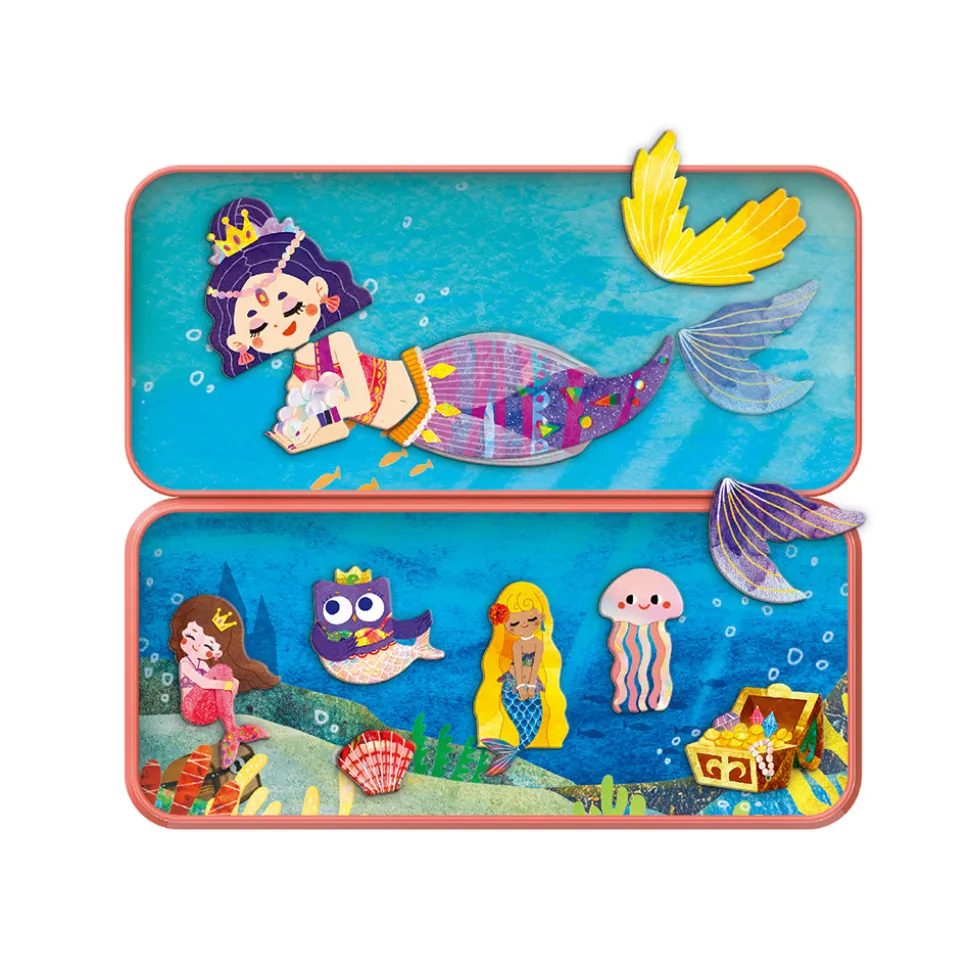 Dette magnetiske legesæt med havfrue-tema indeholder to baggrunde og mere end 30 magnetiske brikker til at sammensætte sin egen figur og finde på sjove historier.