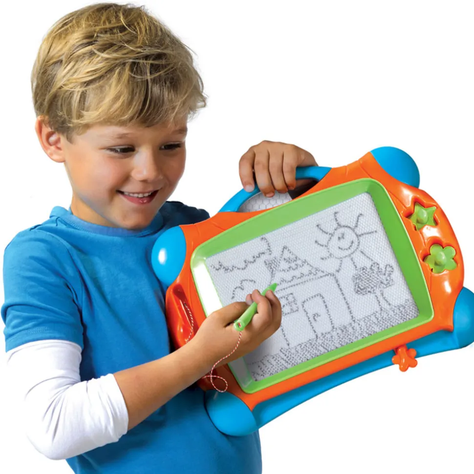 Vil du tegne helt uden oprydning og rod med tucsher og farveblyanter? Prøv det flotte magnetiske tegnebræt. Tegn smukke billeder, og gør dem ekstra fine med stempler. Så snart du er færdig, kan du trække knoppen hen over brættet og slette. Så er du klar til at starte forfra. Et perfekt værktøj til rejser, da du ikke behøver at medbringe ekstra papir eller tuscher. Tegn, helt uden rod igen og igen. Perfekt til rejsen for både de små og store børn.