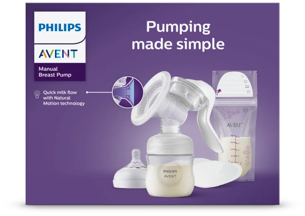 Philips Avent Natural brystpumpe sikre komfortabel pumpning, uanset hvor du går takket være Natural Motion Technology, for hurtig mælkestrøm. Nyd den blide komfort fra Philips Avent bærbare manuelle brystpumpe. Med Natural Motion Technology, inspireret af babys egen suttehandling for en hurtig skuffe. Du kan nemt justere rytme og vakuum.