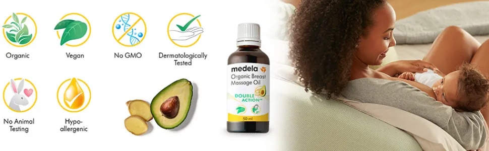 Mange kvinder, der ammer, får ømme og hævede bryster. Medelas økologiske og veganske brystmassageolie indeholder fødevaregodkendte, hypoallergene og naturlige ingredienser. Den dulmer ømme bryster hos ammende mødre gennem sin opvarmende og nærende effekt takket være Double Action™ af avocadoolie og ingefær. Medelas økologiske massageolie til brysterne er velegnet til sensitiv hud, er økologisk og vegansk certificeret, hypoallergen og dermatologisk testet. Det er også nærende og fugtgivende. Uden parfume, uden tilsætningsstoffer. Sikker for mor og baby, ingen grund til at vaske af før amning eller pumpning.