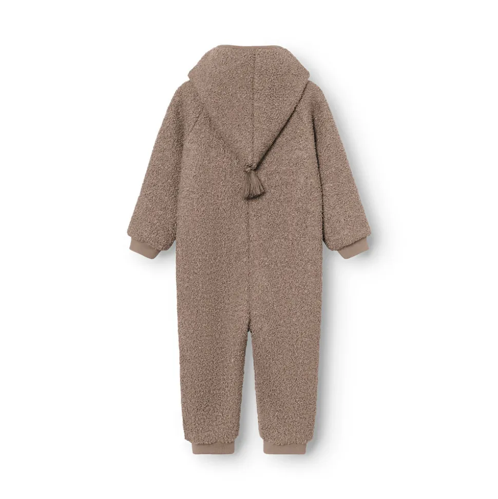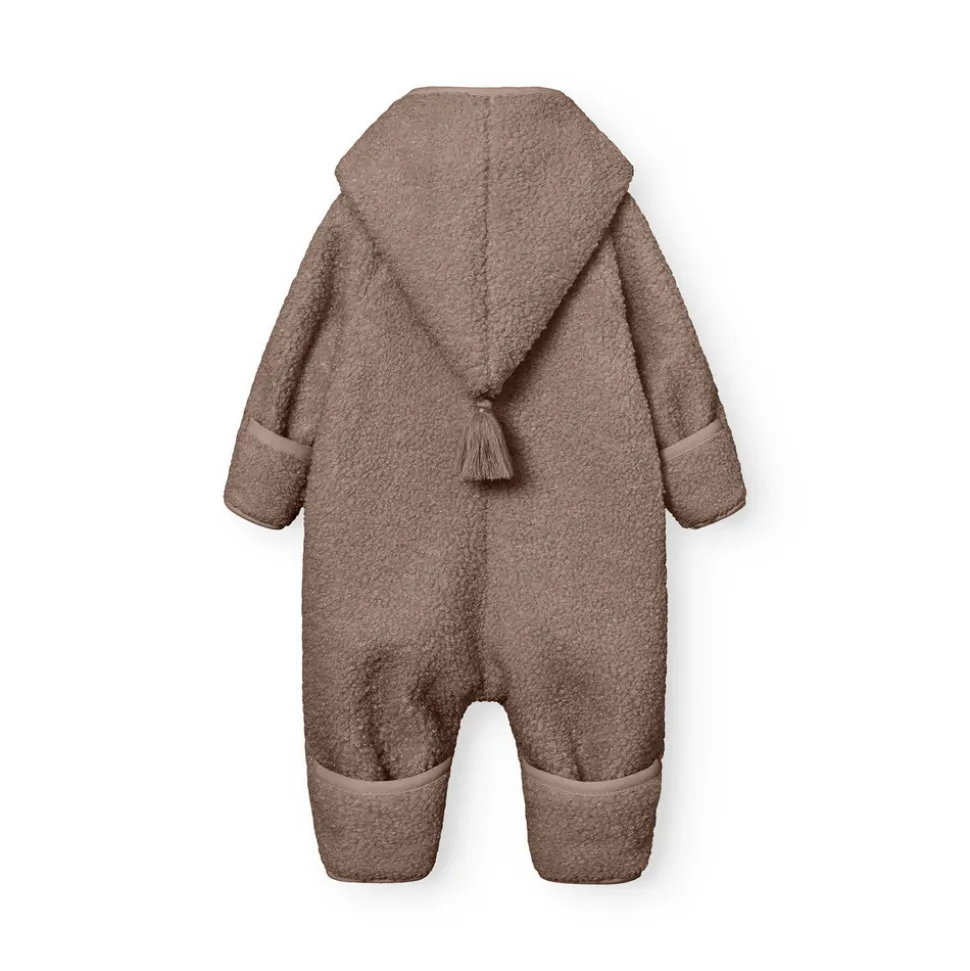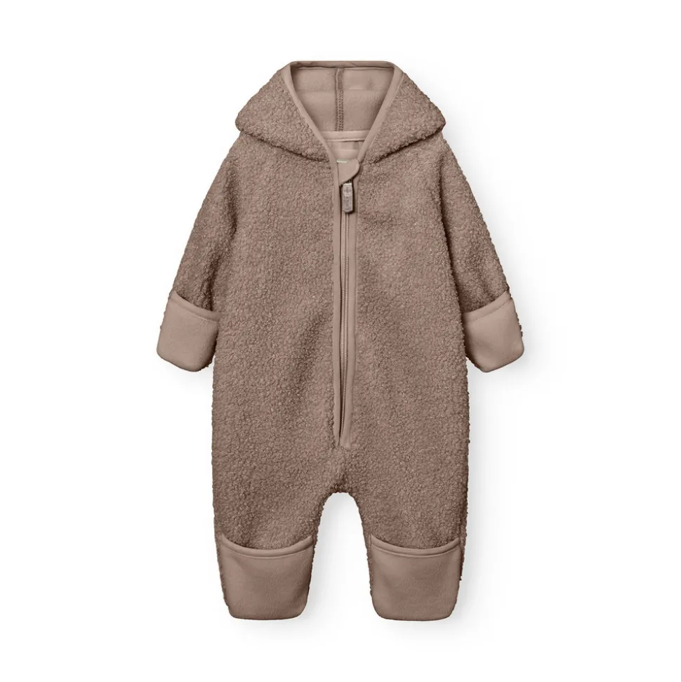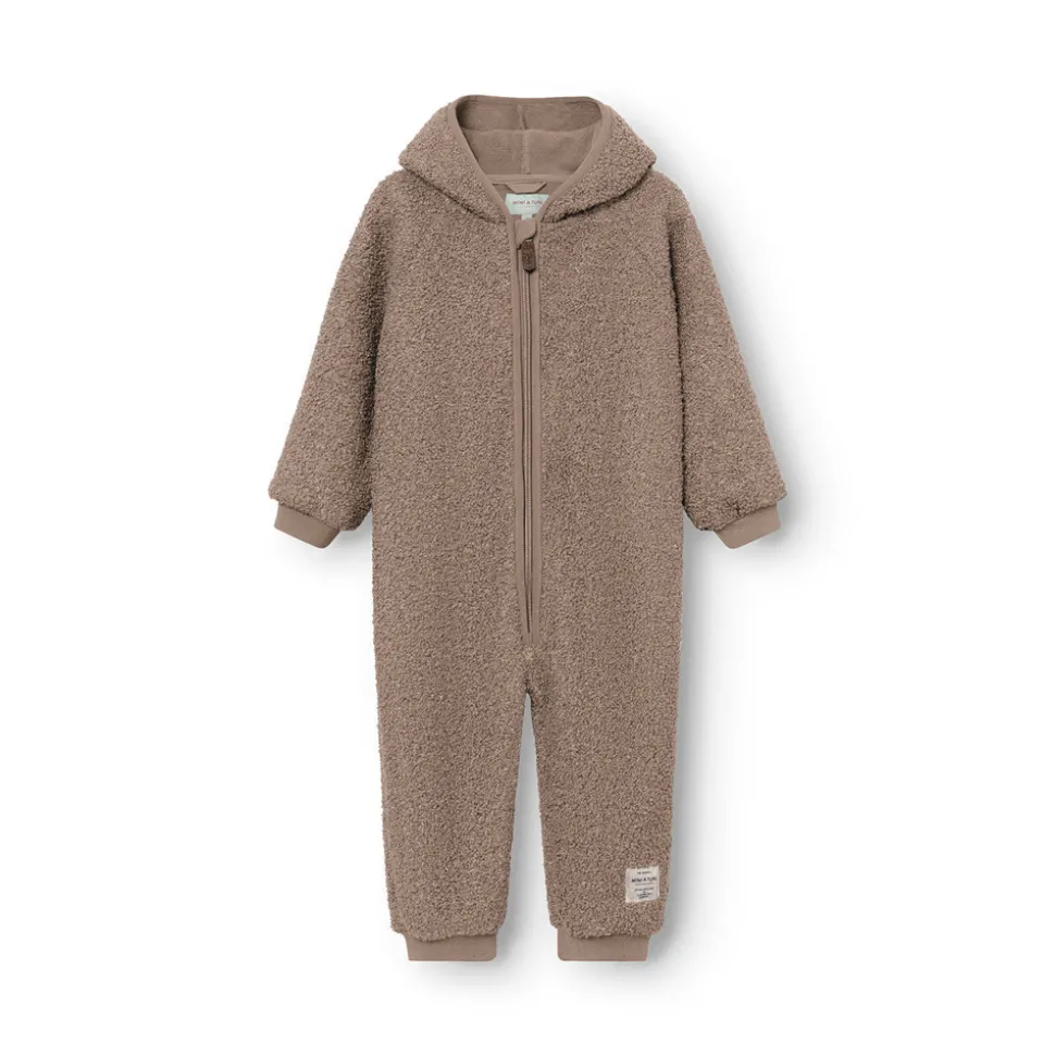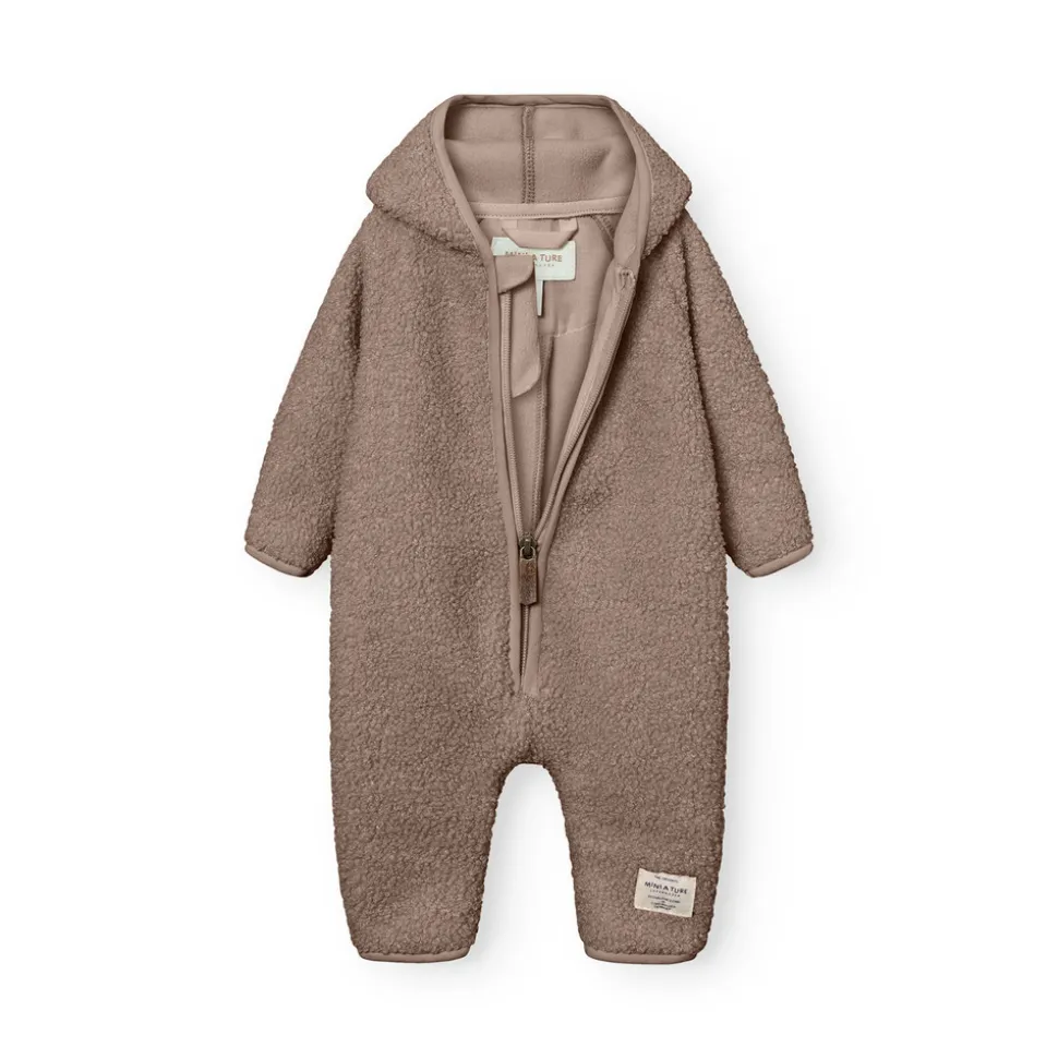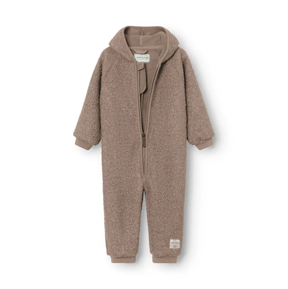 Blød heldragt i teddyfleece fra MINI A TURE fremstillet af genanvendt polyester. Heldragten kommer med et blødt fleecefor og har en spids signaturhætte med kvast. I størrelserne 1m/56cm til 6m/68cm har ærmer og ben indbyggede vanter og fødder. Fra størrelse 9m/74cm og opad afsluttes ærmer og ben med en ribkant.