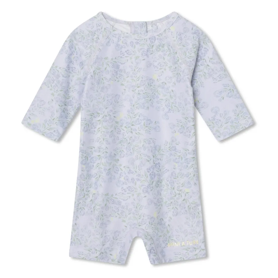 MINI A TURE heldragt til de små med håndtegnet print inspireret af naturen. Dragten har en lang lynlås bag på, hvilket gør den nem at tage af og på. Heldragten er fremstillet af genanvendt polyester.