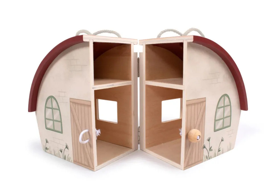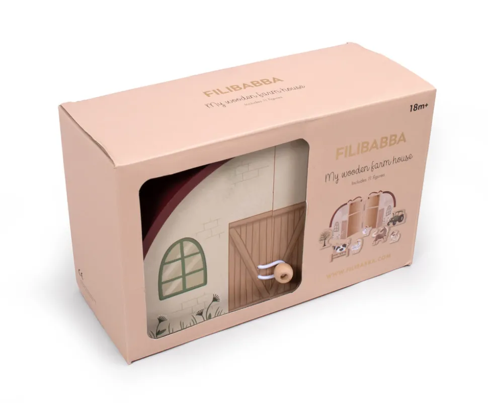 Der er mange timers sjov og lærerig leg på bondegården, hvor kun fantasien sætter grænser. Bondegården i træ er udstyret med håndtag, så den nemt kan tages med som underholdning på farten. Gården kan åbnes op og vil indbyde til leg både omkring og inde i selve huset.