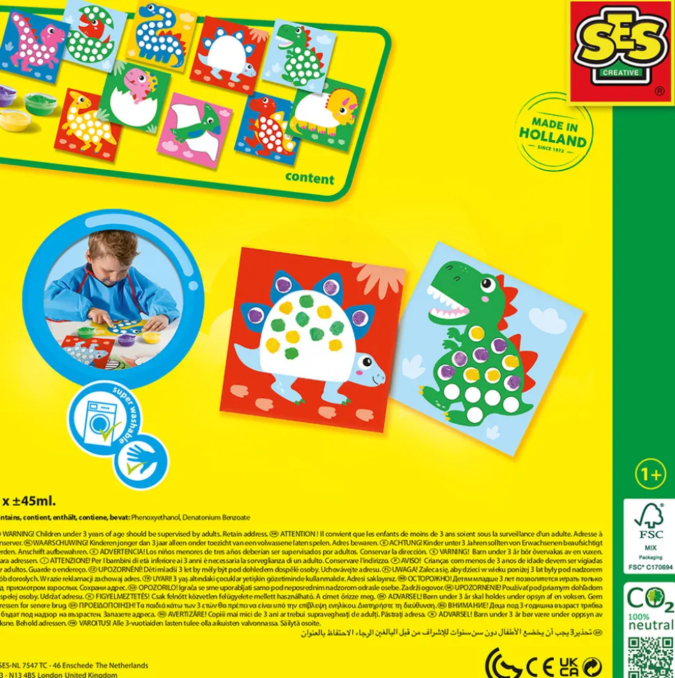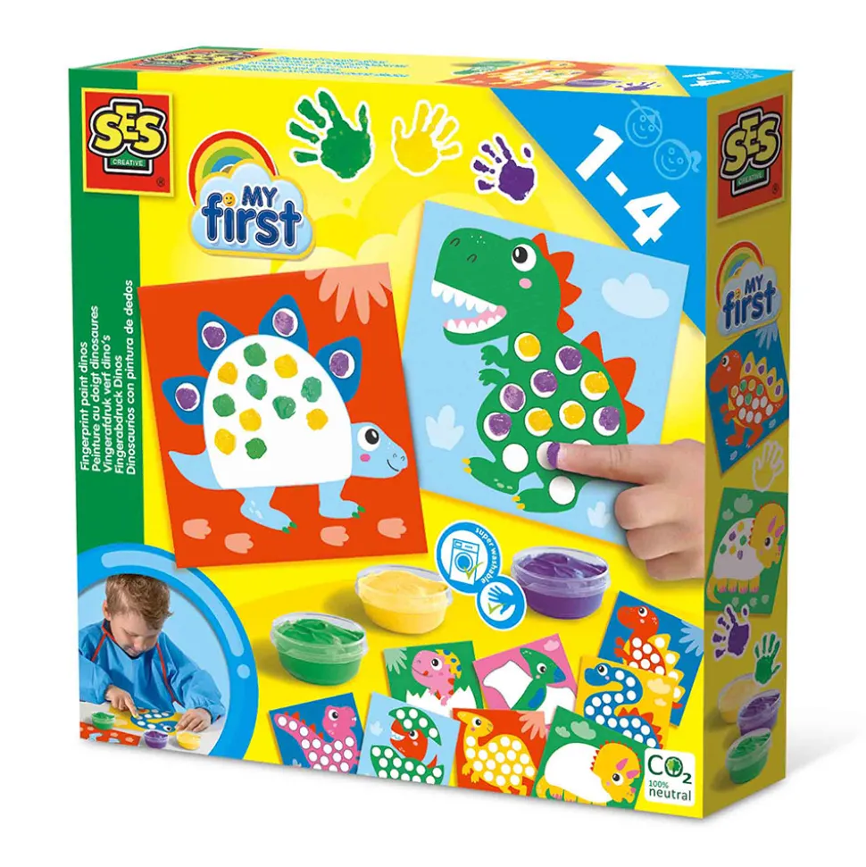 Sættet indeholder 10 dino-kort og 3 farver fingermaling. Børn kan dekorere de forskellige dinosaurer, lige som de vil, ved at bruge fingrene til at male med.