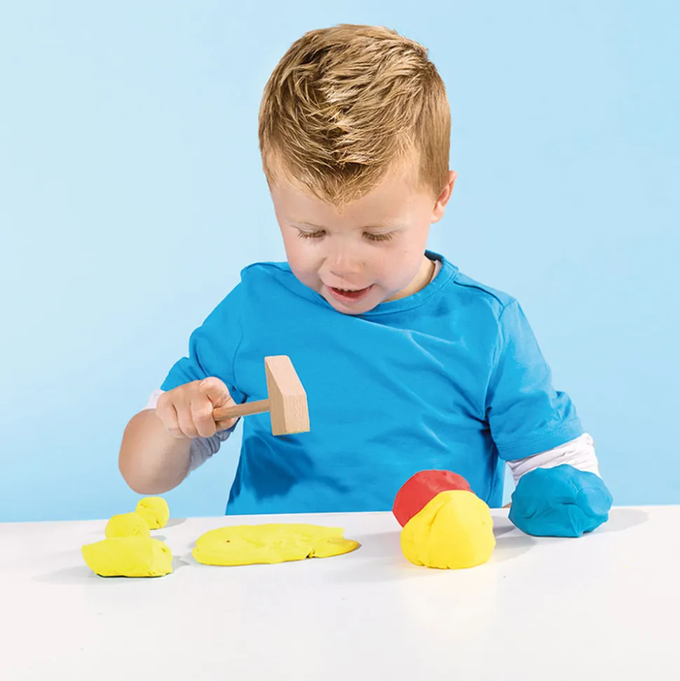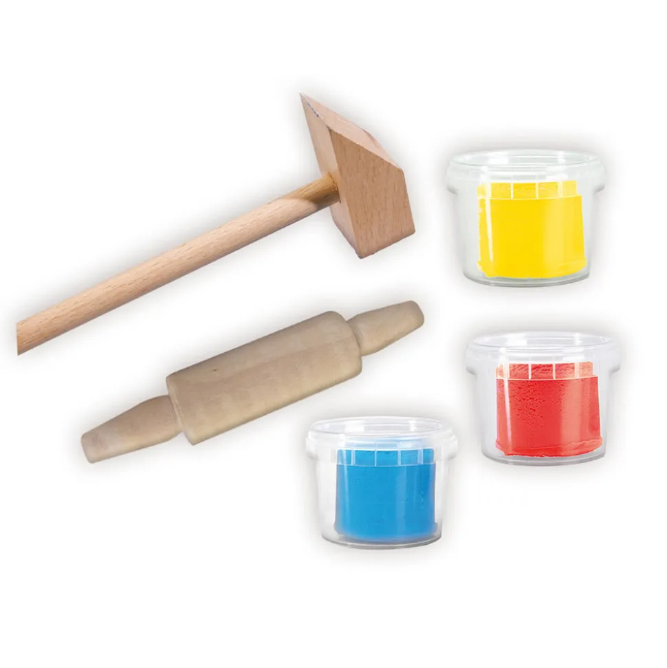 Sættet indeholder: 3 stk modellervoks, gul, rød, blå, 1 kagerulle og 1 hammer.