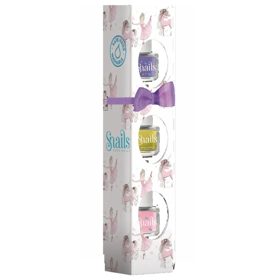 En flot gaveæske indeholdende 3 skønne Snails neglelakker. Neglelakken vaskes nemt og hurtigt af igen, blot med lidt vand og sæbe.