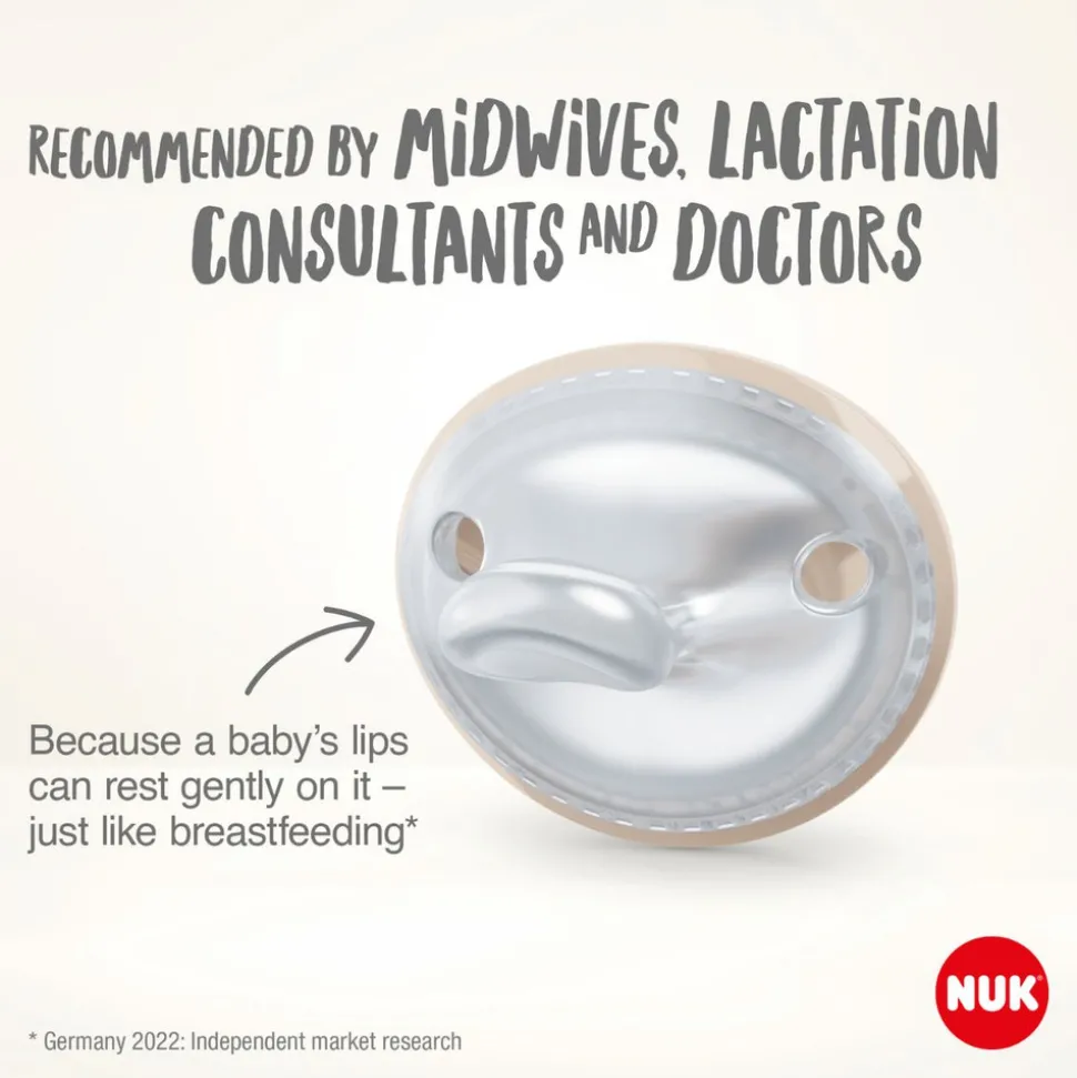Dette betyder, at barnets følsomme hud omkring munden er fri, og luften kan cirkulere frit. NUK MommyFeel forårsager ingen trykmærker på barnets hud og forhindrer hud irritation.