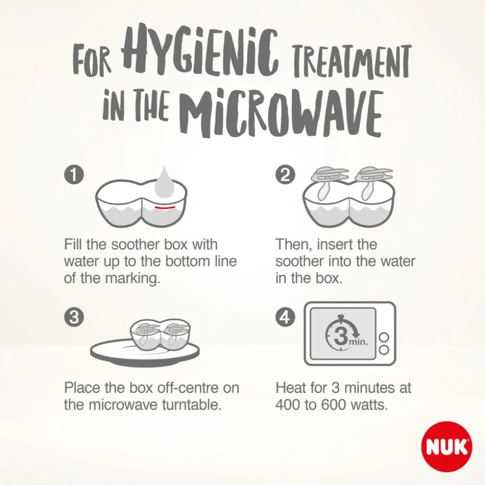 NUK ønsker at give forældre mulighed for at genbruge deres emballage i stedet for at smide den væk. Hver NUK MommyFeel-sut leveres derfor i en robust, genanvendelig boks, der holder sutten ren og beskytter den – især når du er ude at rejse, er dette en ideel løsning. Hjemme kan boksen bruges til sterilisering i mikrobølgeovnen. For at gøre dette, fyld suttens boks med vand op til den nedre markering. Læg sutten med sutte delen nedad. Læs advarslerne og brugsanvisningerne inde i pakken omhyggeligt.