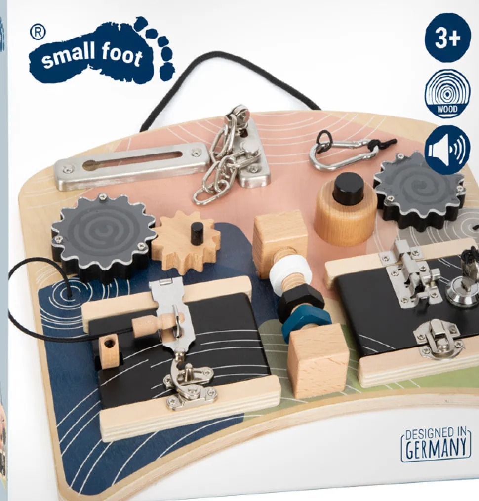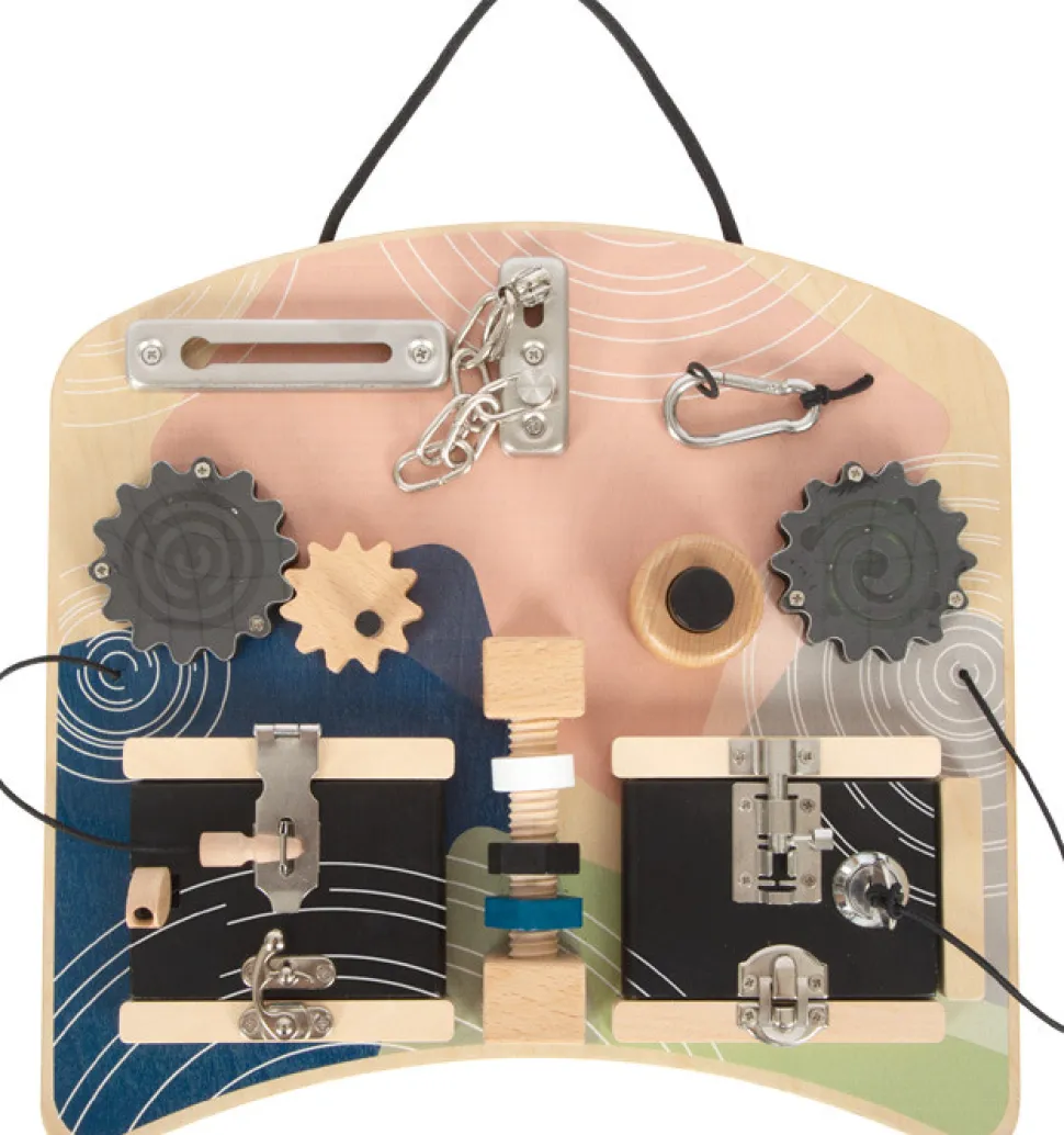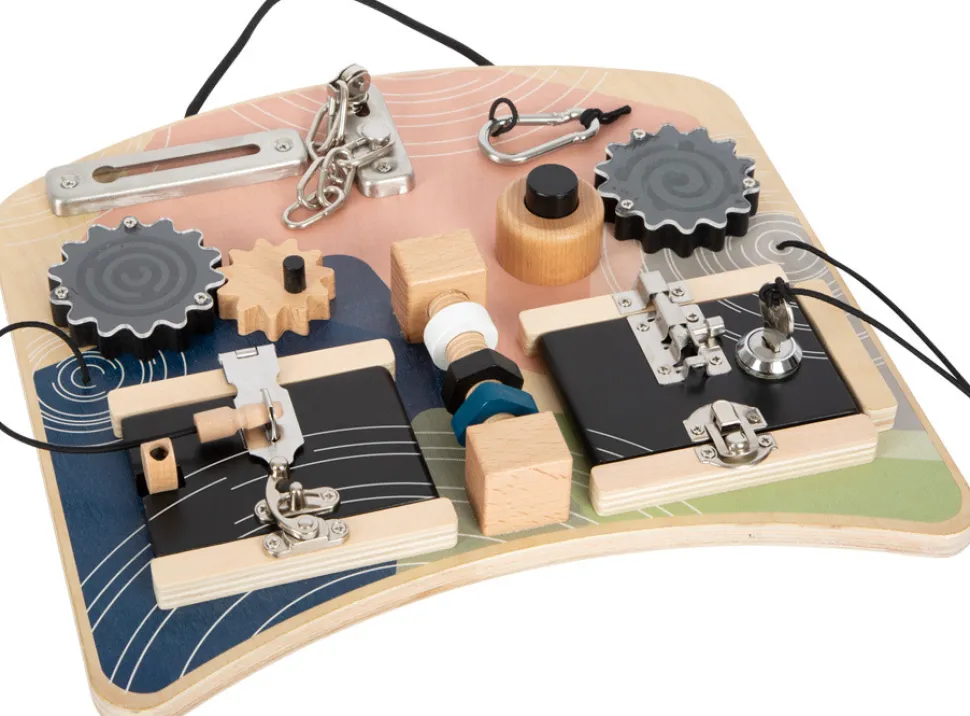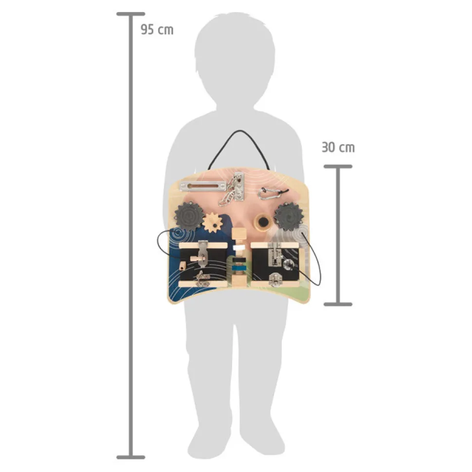 Dette læringsbræt i træ tilbyder 14 forskellige former for motorisk aktivitetssjov med forskellige slags låse og drejespil. Brættet i moderne, trendy farver og masser af synligt træmateriale præsenterer en bred vifte af mulige aktiviteter for at fremme udviklingen af finmotorikken. Fra en fjederkrog med løkke og en dørkæde, en hængelås, en rigellås og en stanglås til en cylinderlås med en nøgle, tilbyder dette aktivitetsbræt tonsvis af låse, som børn kender fra hverdagen og kan øve sig på en sjov måde. Yderligere funktioner som et gearspil med minilabyrint eller en gevindstang med roterende lodrette elementer og et knirkehorn afrunder dette aktivitetsbræt. Når børn åbner, lukker og drejer, træner de legende deres gribefærdigheder og hånd-øje-koordination. Dette legetøj er inspireret af Montessori-undervisningsmetoden, der udvikler motorikken optimalt. Dens ergonomiske form med en fordybning giver mulighed for behagelig leg foran barnet eller på skødet. Inkl. praktisk greb til at bære eller hænge op. Stangen og nøglen er bundet til et elastikbånd, så de ikke bliver væk.
