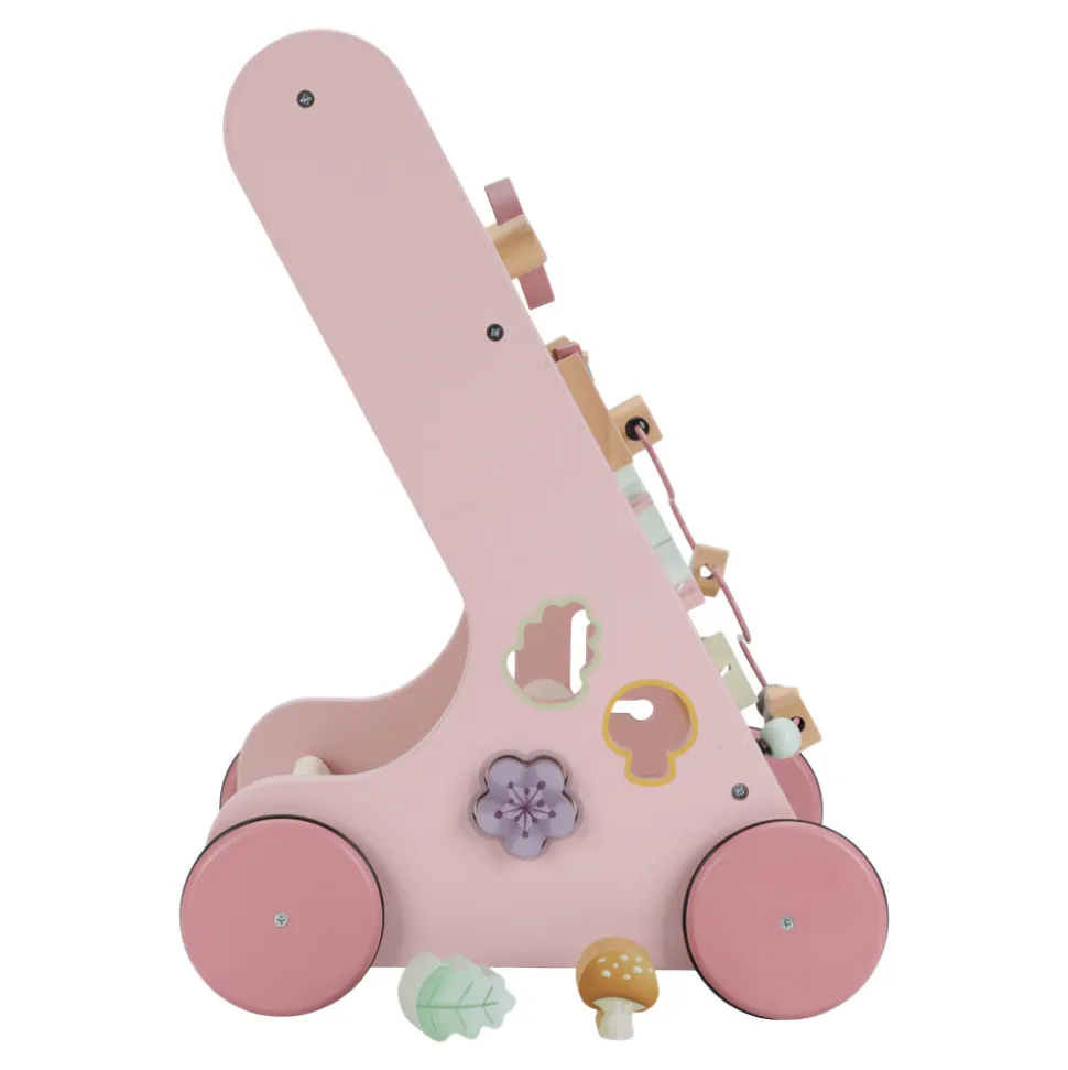 Gå, leg og lær! Aktivitets gåvognen i træ byder mange sjove og spændende aktiviteter der understøtter udviklingen af dit barns motoriske færdigheder. Se hvordan lyset reflekteres, hvis du giver et drejer på spejlet eller prøv at dreje hjulet for at se de små elemnter gå rundt og rundt! Giv din baby nogle sjove udfordringer med de mange spændende aktiviteter i denne smukt designede gåvogn. Der er 8 aktiviteter at udforske og lege med og takket være det smarte design er gåvognen meget velegnet til at lære børn at gå fra de er ca. 12 måneder og op. Forbered dig på lyde af fryd når din lille suser gennem huset. Gummihjulene er lavet så der ikke kommer mærker på gulvet og gør gåvognen den sikker at bruge indenfor.