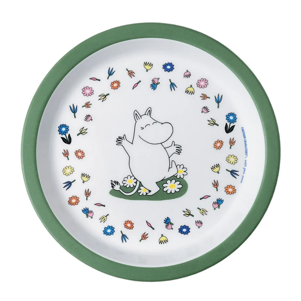 Tallerken med Mumi er rigtig god, når barnet begynder at spise selv. Den praktiske kan på tallerkenen gør det nemmere for barnet at få maden op på gaflen.