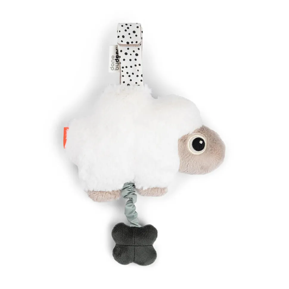 Beroligende musikuro til din baby! Denne musikuro er designet til at berolige og underholde dit barn. Træk i den knitrende kløver, og din baby vil nyde den beroligende musik, mens Sheepy fanger opmærksomheden med sit åbne øje på den ene side og lukkede øje på den anden. Legetøjet spiller den søde melodi ‘Welcome to our world of toys’, som vil skabe en rolig atmosfære.