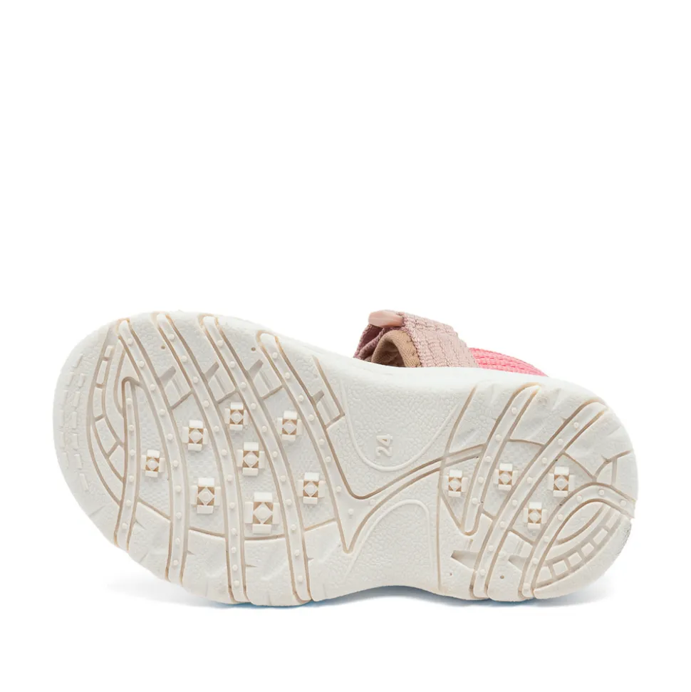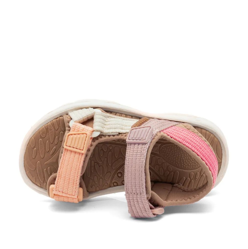 Den livlige og recycled tekstiloverflade tilføjer sandalen en fleksibel og behagelig pasform. Indersålen tilbyder exceptionel støddæmpning for optimal komfort hele dagen. Sålerne tørrer hurtigt ved kontakt med vand, hvilket gør sandalen perfekt til leg ved stranden og diverse eventyr. Justerbar velcro ved både anklen og forfoden sikrer en naturlig pasform og nem tilpasning. Det åbne tå- og hældesign holder små fødder kølige og friske på varme sommerdage. Den fleksible letvægtsydersål med stødabsorbering giver en fjedrende og blød fornemmelse, som fremmer en naturlig gang. Sandal med god volumen og mulighed for tilpasning til bredde fødder.