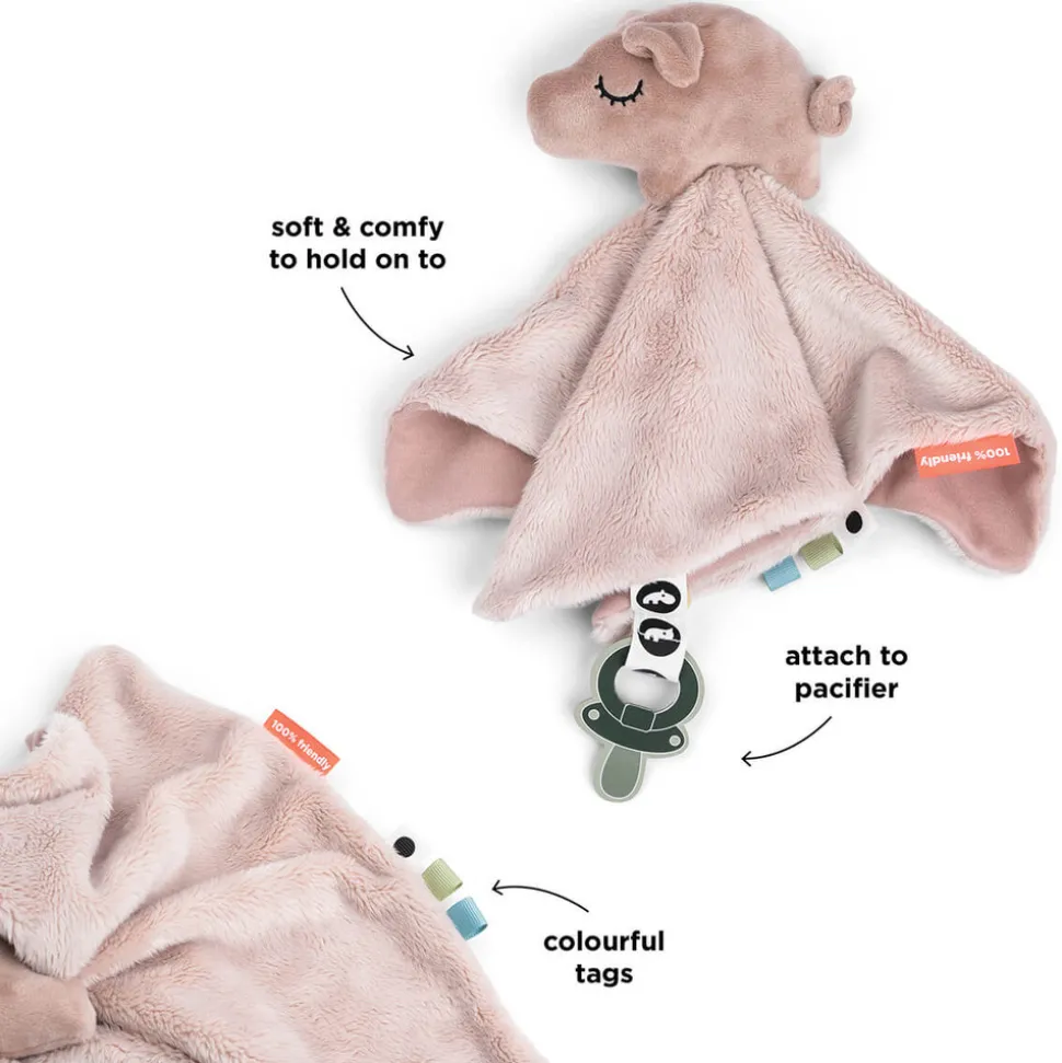 Blød og trøstende nusseklud til dit barn, der er designet til at stimulere dit barns sanser og give tryghed. De forskellige teksturer og farvede tags vil stimulere dit barns sanser, mens den bløde og behagelige klud er perfekt for små hænder at holde fast i og kramme.