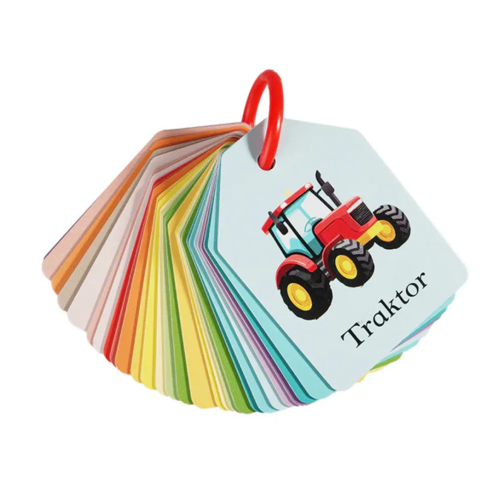 “På Gården” ordkort tilbyder en engagerende måde at introducere børn til bondegårdens verden med dyr og maskiner. Hvert kort indeholder levende illustrationer, såsom en venlig ko eller en lysende grøn traktor, kombineret med tilsvarende danske ord, hvilket gør læringsprocessen både sjov og lærerig. Kortene er designet til at være robuste, så de kan modstå hyppig brug.