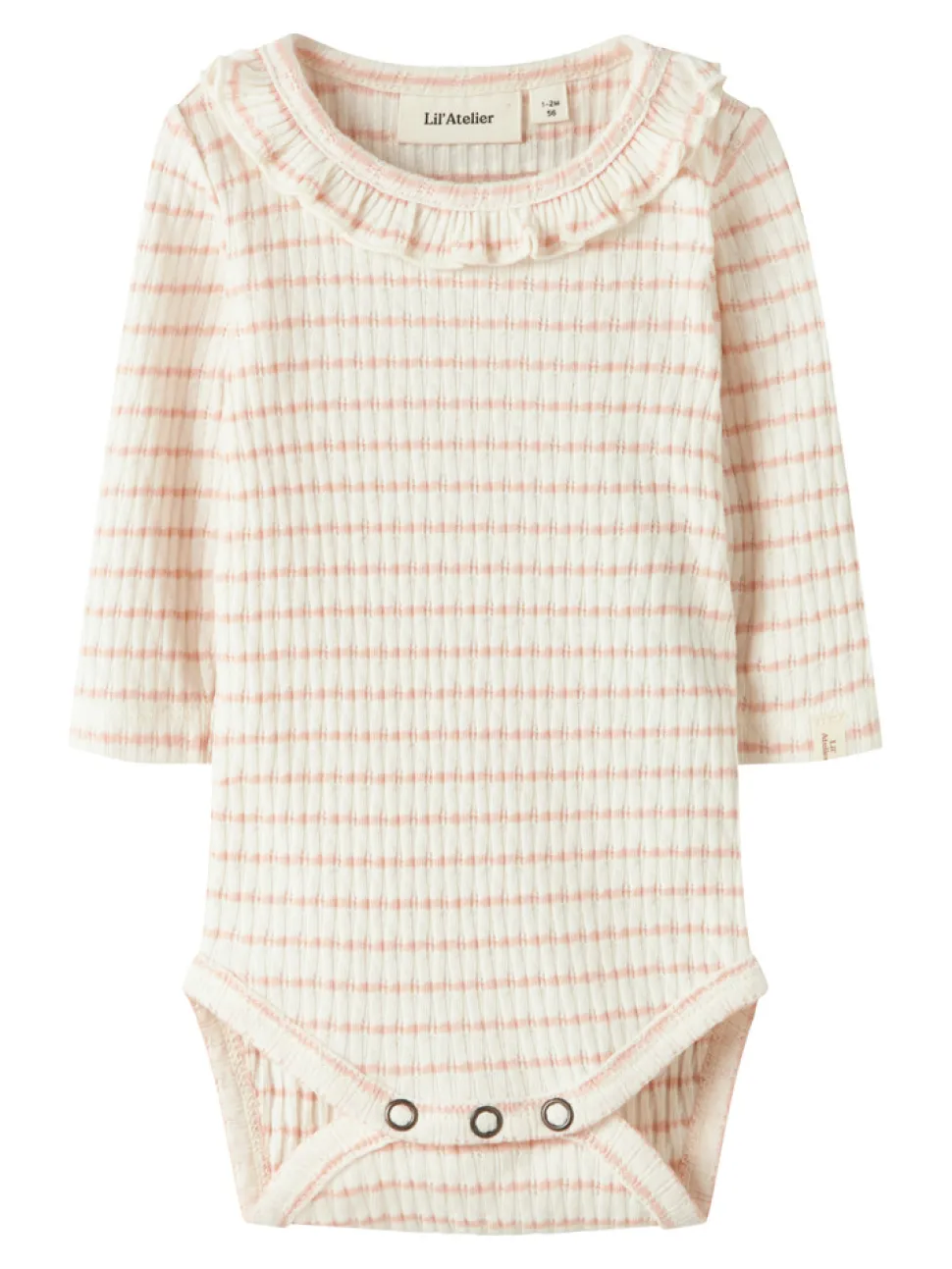 Sæt det perfekte outfit sammen til dit barn med kvalitetsstyles til hverdagen, og skab et behageligt og trendy look.Jersey er et let og elastisk stof med en blød overflade og inderside, der giver en behagelig fornemmelse og bevægelsesfrihed. – Produkttype: Bodysuit – Halsudskæring: Rund halsudskæring – Ærmer: Lange ærmer (L/S) – Lukning: Trykknaplukning – Ekstra detaljer: Flæser, mærke – Advarsel: ADVARSEL! Holdes væk fra ild