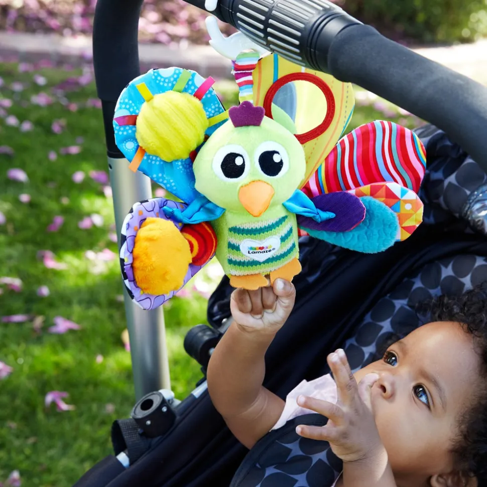 Lamaze Påfugl rangle Ranglen kan let monteres på seng, kravlegård eller lignende. Ranglen har forskellige effekter, så som bidering, knitrestoffer, piv lyd og bløde overflader.
