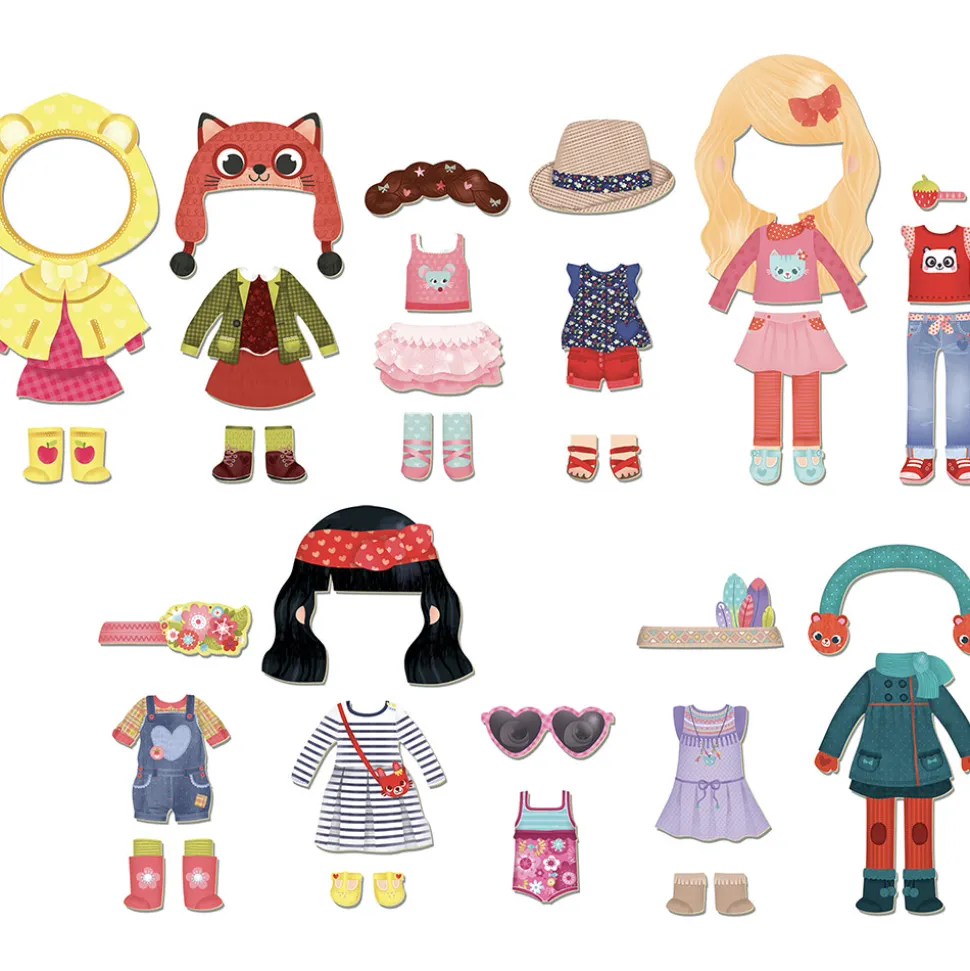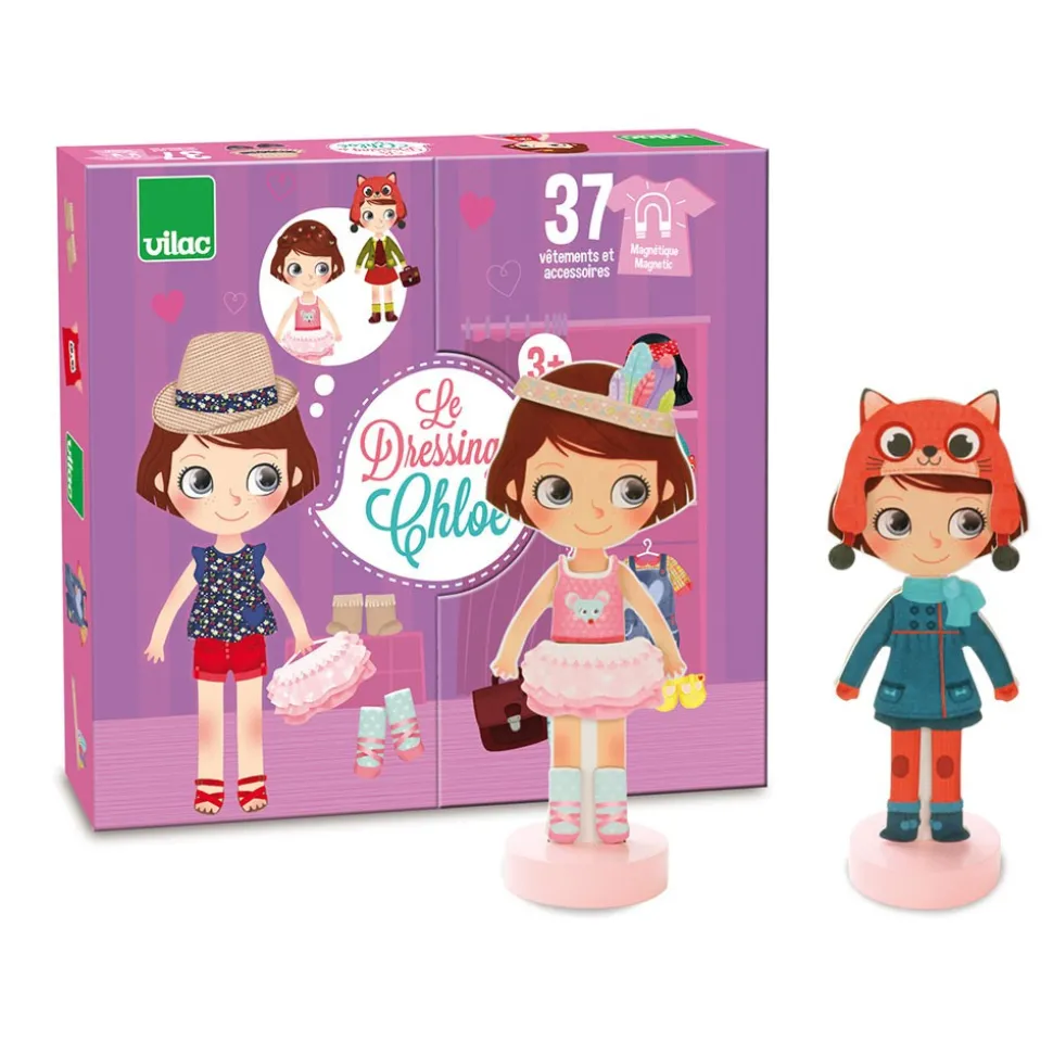 Den klassiske påklædningsdukke i et moderne udtryk. Lavet i træ med fod, så hun selv kan stå op, og magnetisk, så tøjet bliver siddende. Hun har flere smukke outfits både til sommer og til vinter, til skole og fritid. Sættet indeholder ialt 42 magnetiske dele: nederdele, kjoler, hatte og bukser. Chloe kan endda skifte frisurer.