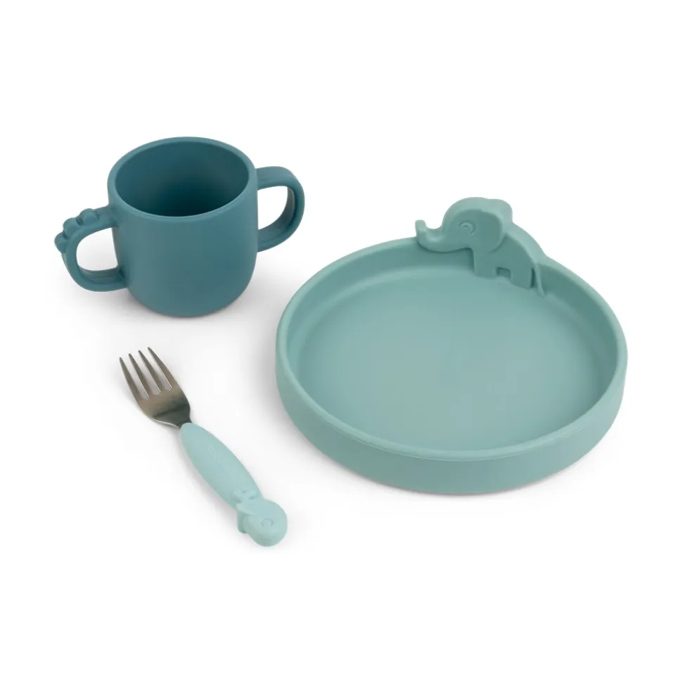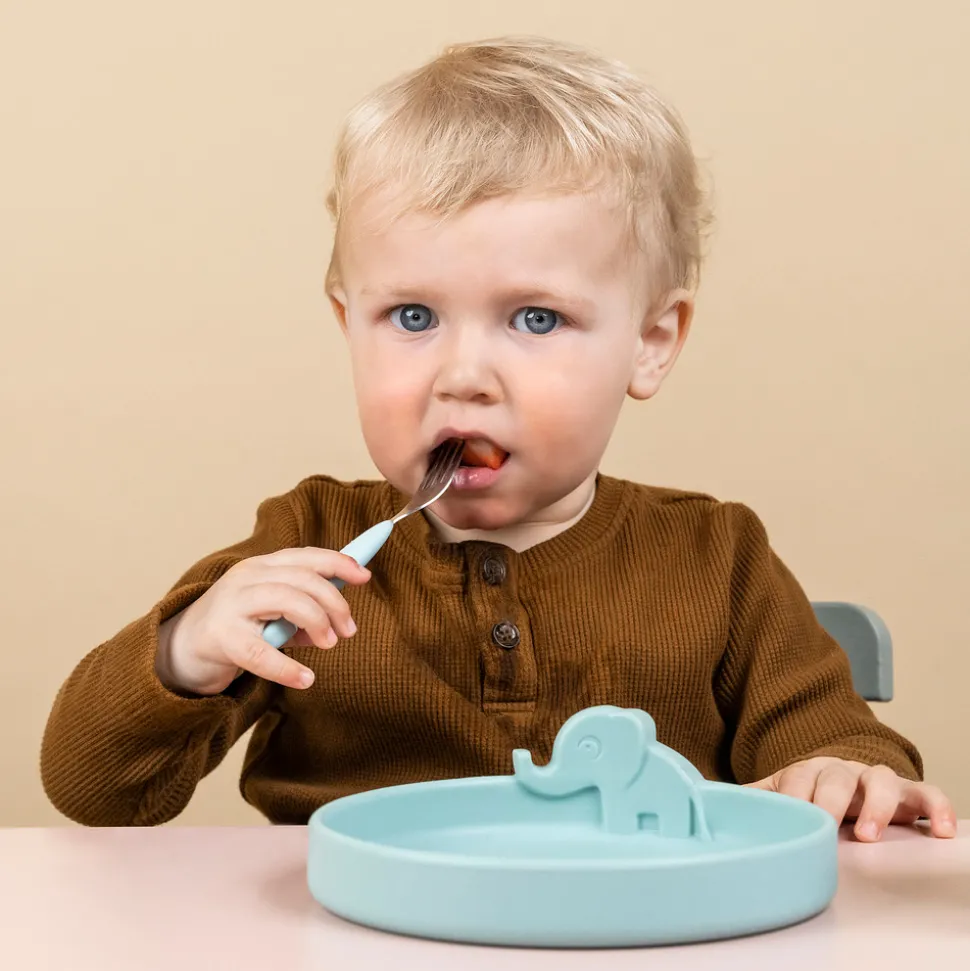 Peekaboo spisesættet er designet til at vække barnets nysgerrighed. Elphee, Wally og Croco titter frem fra servicet og gør spisetid ekstra sjovt. Børne servicet har en perfekt størrelse til de første måltider og når de små skal lære at spise selv. Den søde tallerken, gaffel og praktiske kop med 2 hanke er lavet i fødevaregodkendt silikone, som gør det brud- og skridsikkert og ikke mindst sikrer et godt greb for barnet. De små vil elske at have de søde dyr med til bords + opdag Croco i bunden af koppen når der drikkes, og lad Elphee og Wally hjælpe de små med at nå den spændende milepæl med at kunne spise selv.