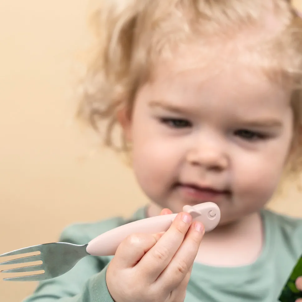 Peekaboo spisesættet er designet til at vække barnets nysgerrighed. Elphee, Wally og Croco titter frem fra servicet og gør spisetid ekstra sjovt. Børne servicet har en perfekt størrelse til de første måltider og når de små skal lære at spise selv. Den søde tallerken, gaffel og praktiske kop med 2 hanke er lavet i fødevaregodkendt silikone, som gør det brud- og skridsikkert og ikke mindst sikrer et godt greb for barnet. De små vil elske at have de søde dyr med til bords + opdag Croco i bunden af koppen når der drikkes, og lad Elphee og Wally hjælpe de små med at nå den spændende milepæl med at kunne spise selv.