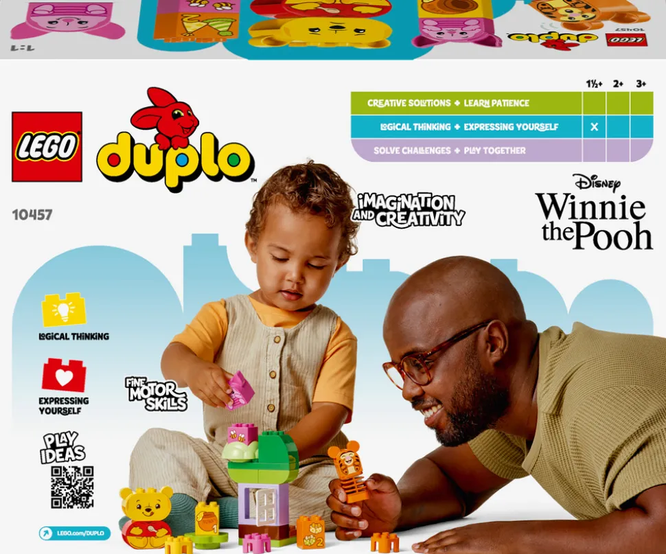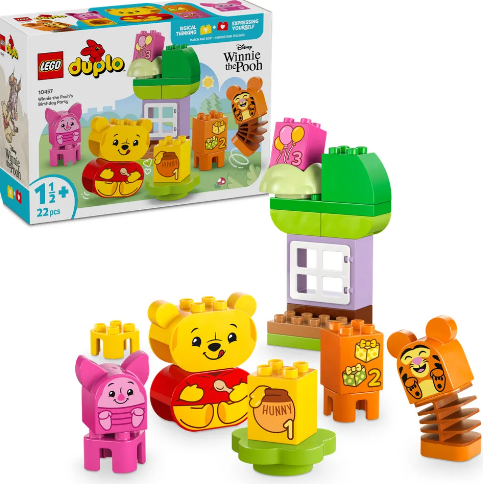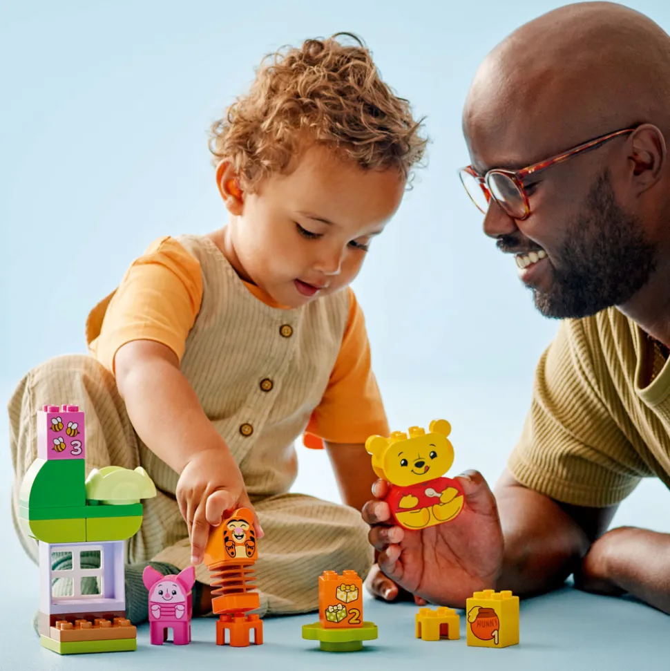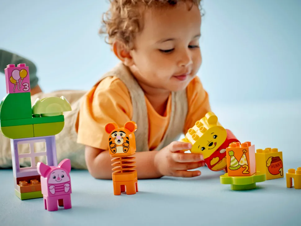 Forældre og små børn kan nyde kreativ leg og læring med LEGO® DUPLO® ǀ Disney-sættet Peter Plys’ fødselsdagsfest (10457). Dette farverige byggesæt er designet til børn fra 18 måneder og hjælper dem med at udvikle tidlige færdigheder gennem fantasifuld leg. Små børn kan deltage i en fest med de tre LEGO DUPLO-figurer af Peter Plys, Tigerdyr og Grisling, som hver har dobbeltsidede ansigter med forskellige udtryk, der fremmer kreativ leg og historiefortælling. Denne funktion understøtter også sociale og følelsesmæssige læringsaktiviteter, hvor børn kan udforske forskellige følelser, som de kan opleve til fester, fra glæden ved at åbne gaver til ubehag efter at have spist for meget. Med dette byggesæt kan børn øve sig i farvesortering ved at matche fødselsdagsgaverne med dyrefigurerne. Hver gave er nummereret, hvilket hjælper børn med at tage deres første skridt mod at lære at tælle.