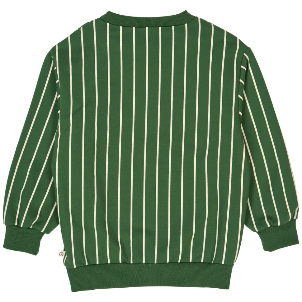En smart og komfortabel sweattrøje i en flot grøn farve med lodrette cremefarvede striber, der giver et moderne og legende udtryk. Trøjen er lavet i en let og strækbar sweatkvalitet med børstet inderside, som føles ekstra blød og behagelig mod huden – perfekt til både leg og afslapning.