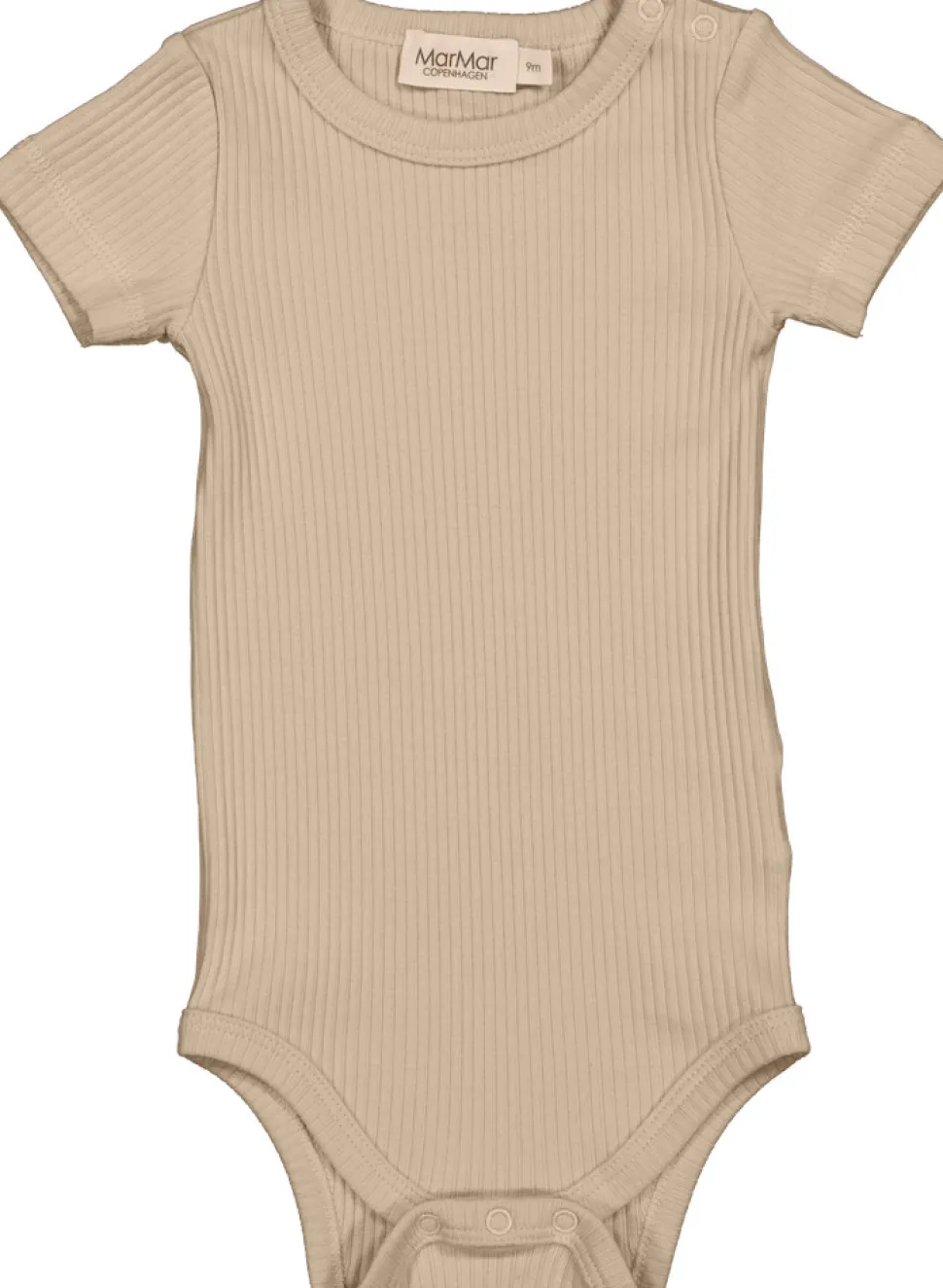 Enkel kortærmet modal bodystocking, der bliver lukket med trykknapper mellem benene for nem bleskiftning. Bodystockingen er ribstrikket, blød, holder form og farve og har elastan i sig som gør den strækbar og behagelig at have på.
