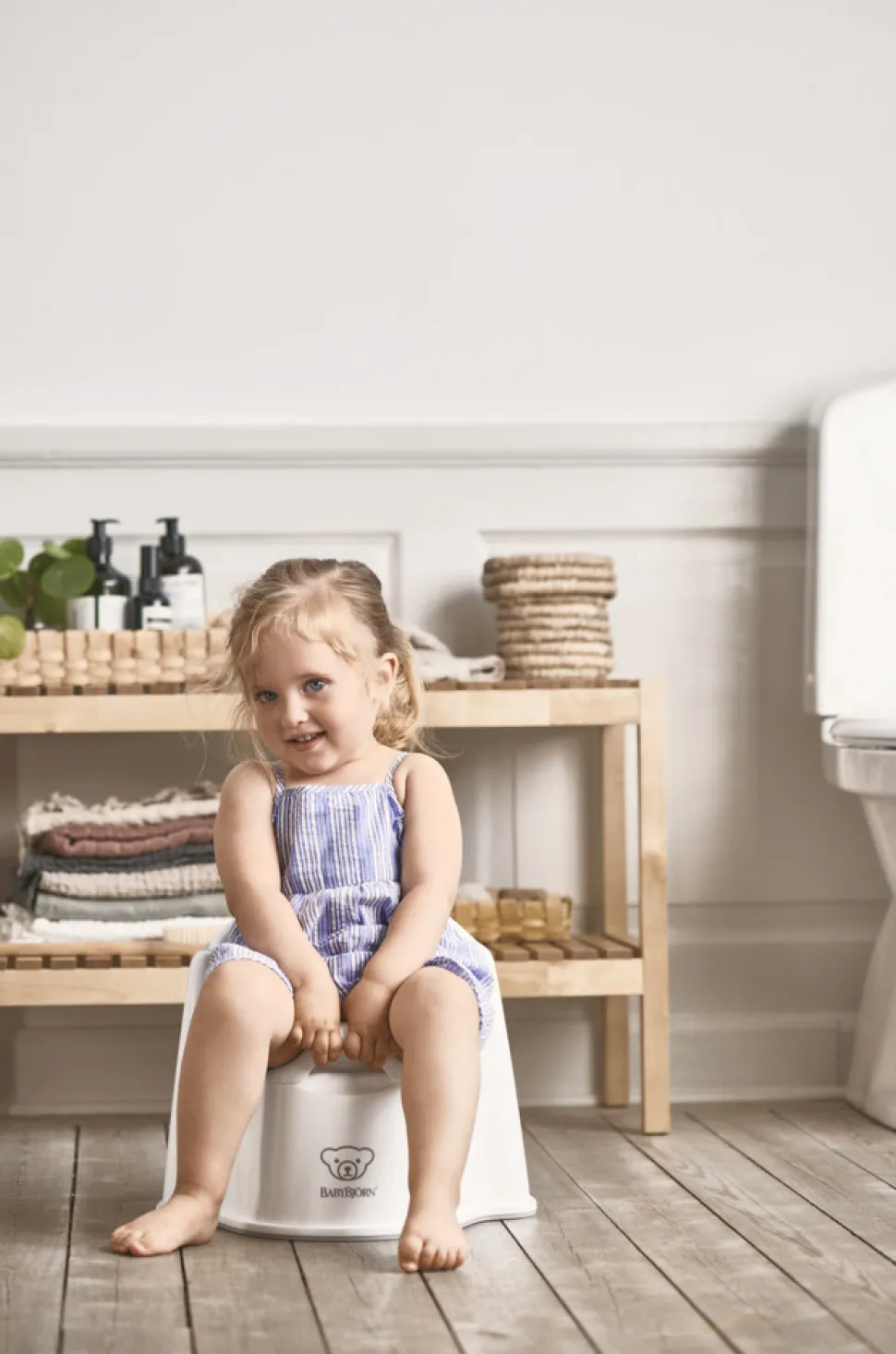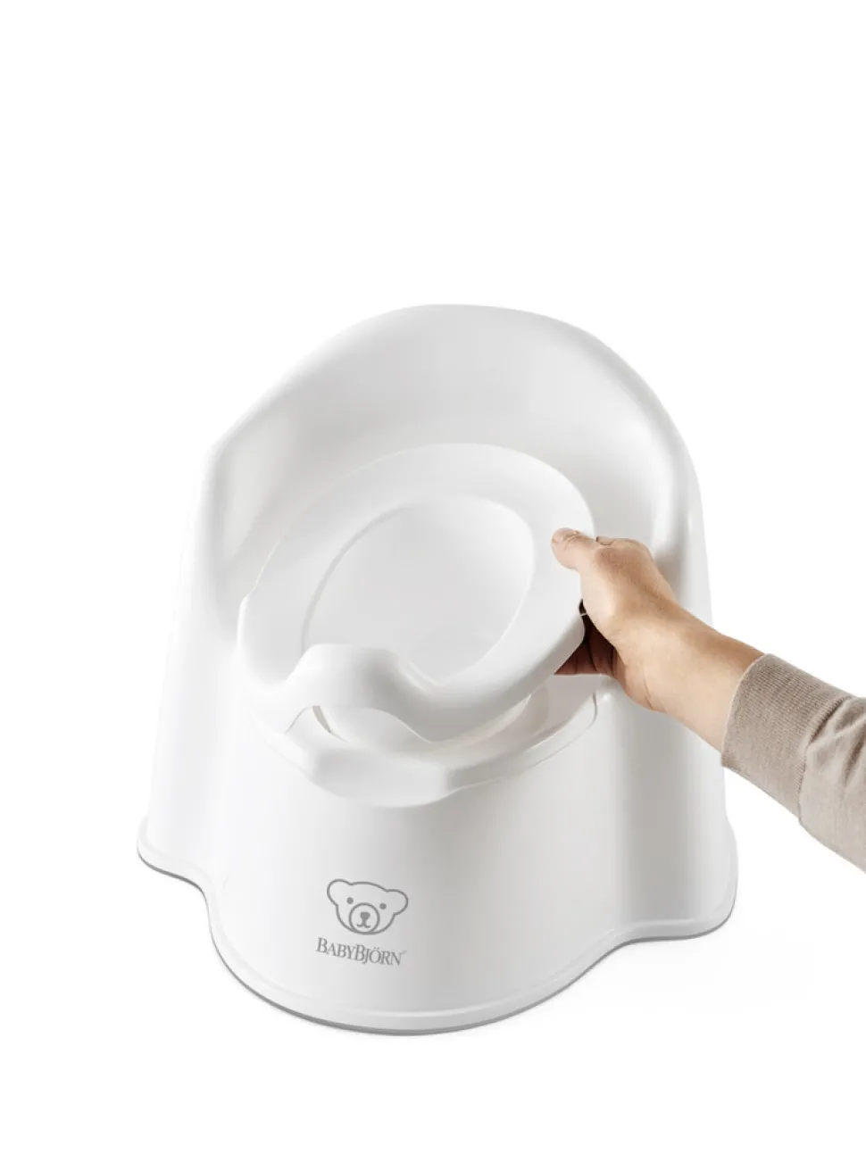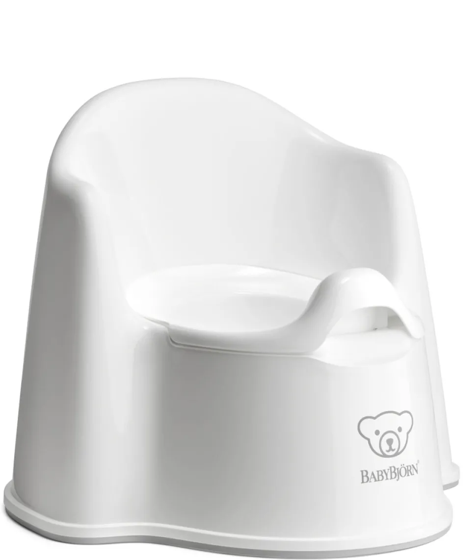 Pottestol med praktisk indsats og bløde former. BabyBjörn` s Pottestol er med sin høje ryg og komfortable armlæn et godt sted at begynde livet uden bleer. Det ergonomiske design tilbyder masser af benplads og den indre potte har tisseværn og er nem at tage ud ved tømning og rengøring. BabyBlörn pottestolen har bløde former fordi det skal være en komfortabel oplevelse at sidde på den.