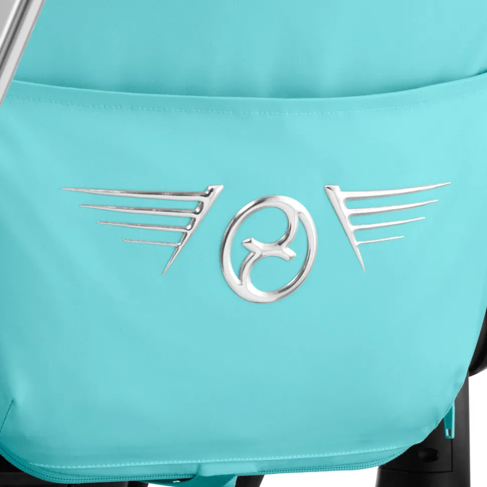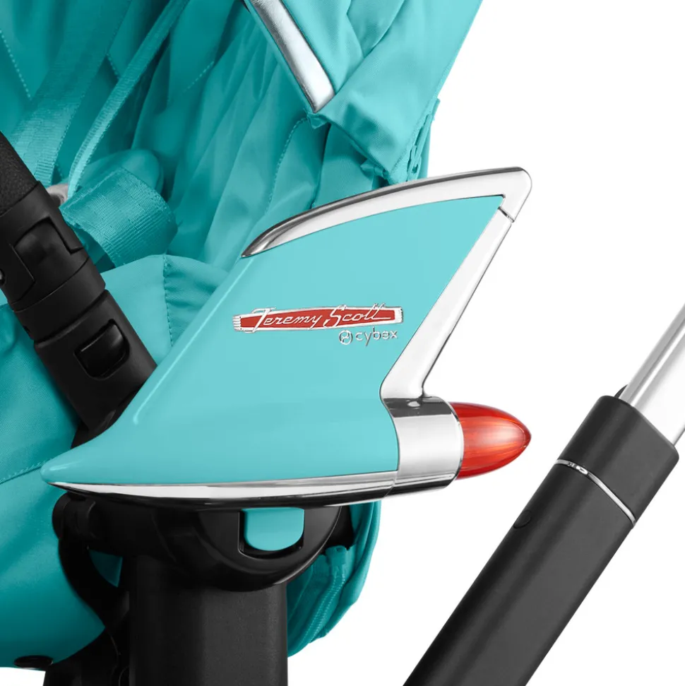 De elegante halefinner, skinnende kromdetaljer og den dristige turkise farve skaber et iøjnefaldende look, der emmer af personlighed og kant. Bag det legende ydre gemmer sig gennemtænkte funktioner og kompromisløs komfort – skabt til forældre, der ønsker både stil og substans.