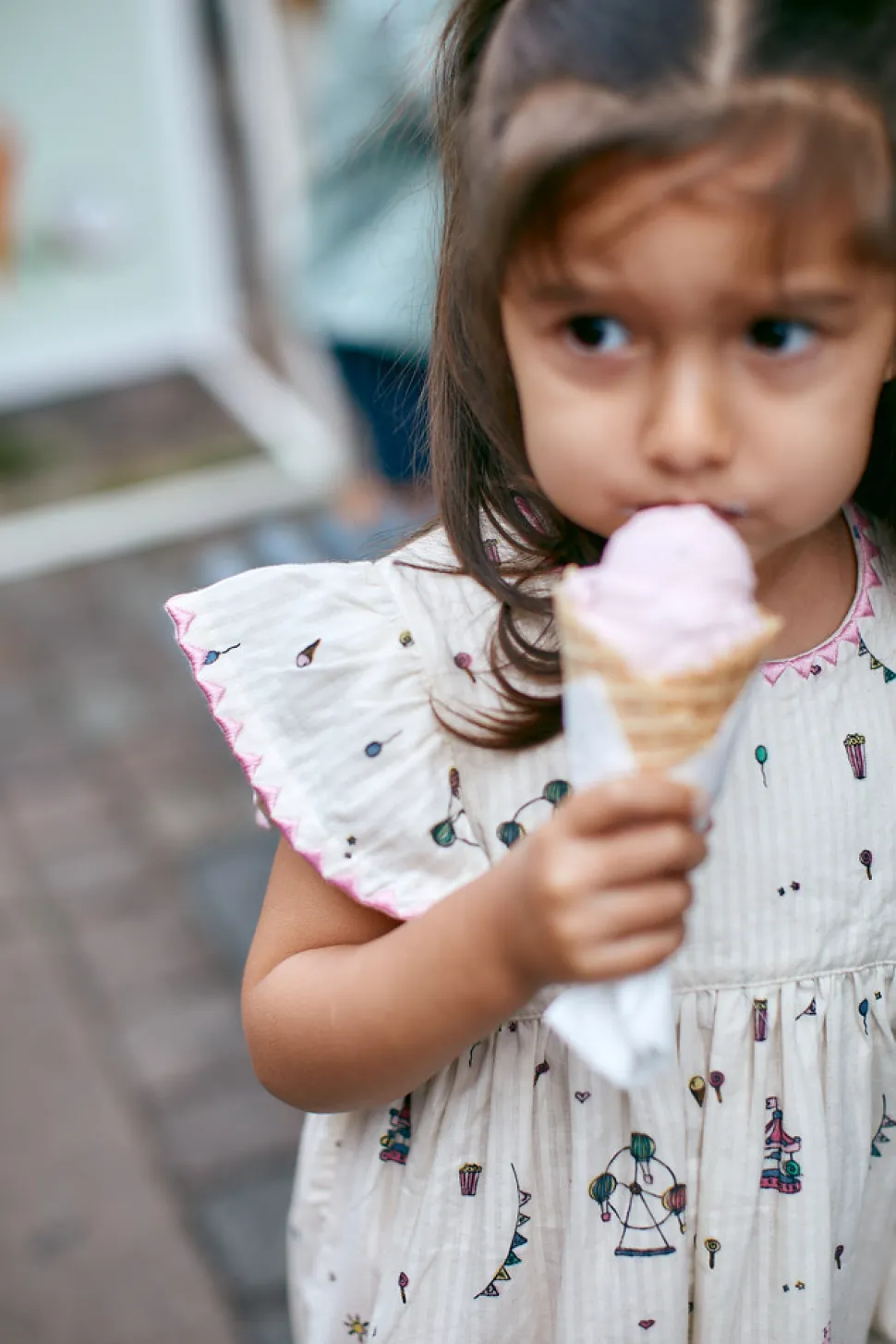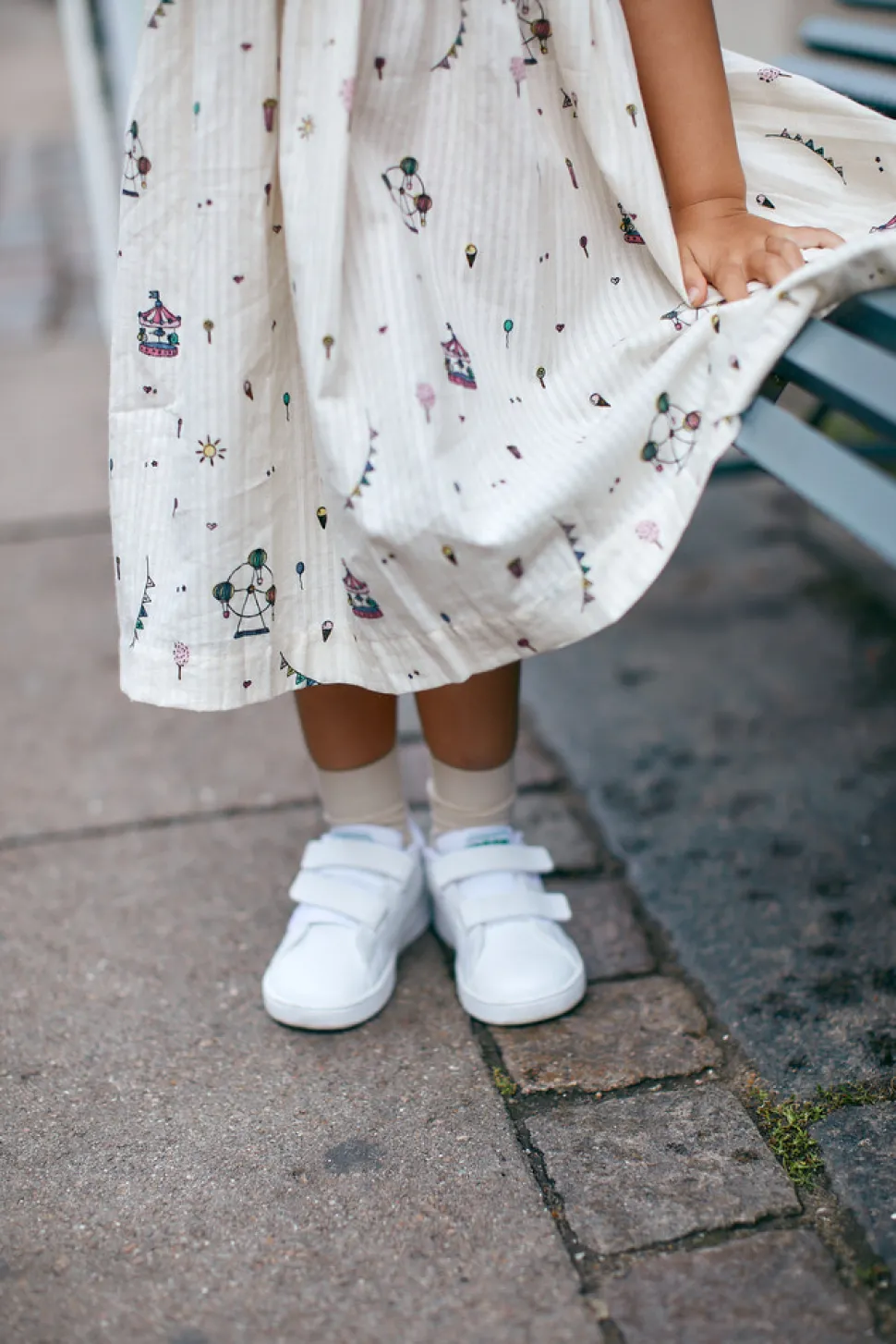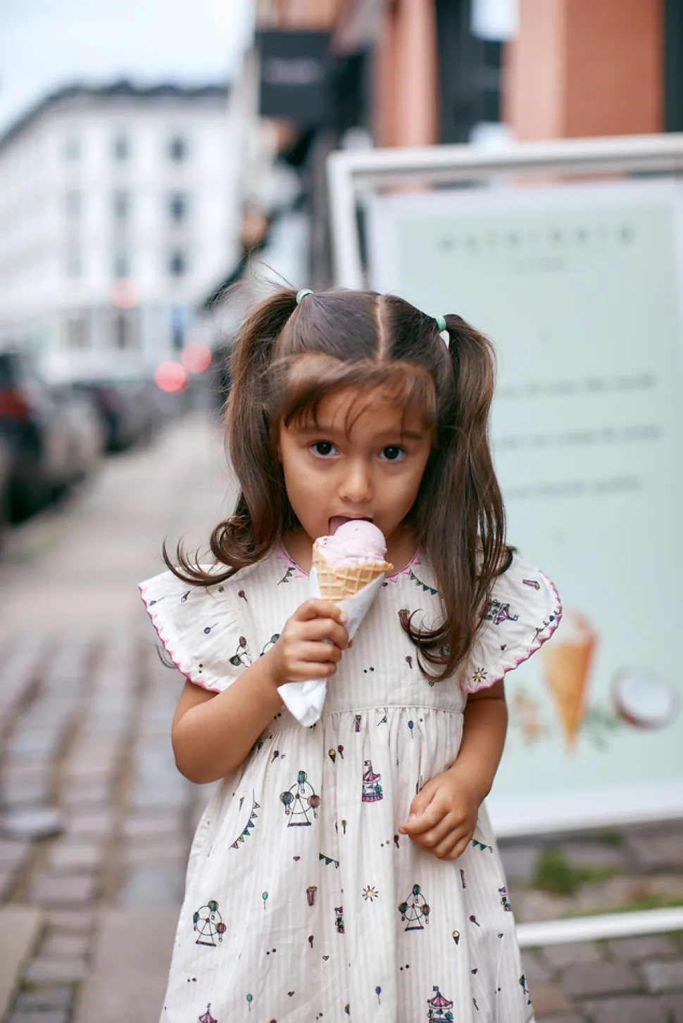 Den printede kjole med flæseærmer er den perfekte kombination af stil og komfort til dit barn. Med et charmerende print og søde flæseærmer tilføjer denne kjole et legende og feminint touch til enhver garderobe. Den bløde og åndbare stof sikrer komfort hele dagen, så dit barn kan føle sig både smuk og behagelig. Den afslappede pasform giver fri bevægelighed, hvilket gør den ideel til både leg og festlige lejligheder. Perfekt til både hverdagsbrug og specielle begivenheder, denne kjole er et must-have for enhver lille modeelsker. 100% Øko bomuld