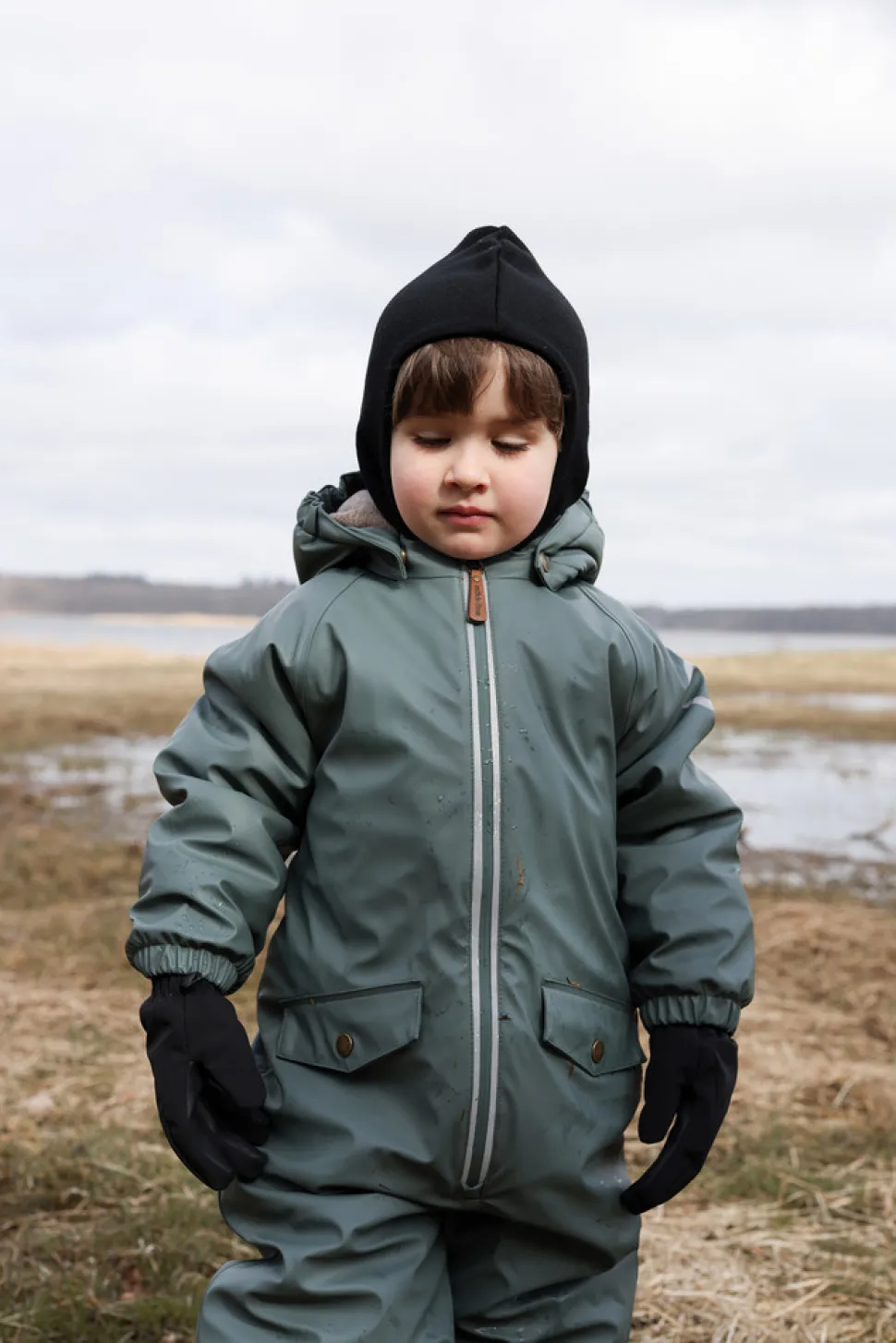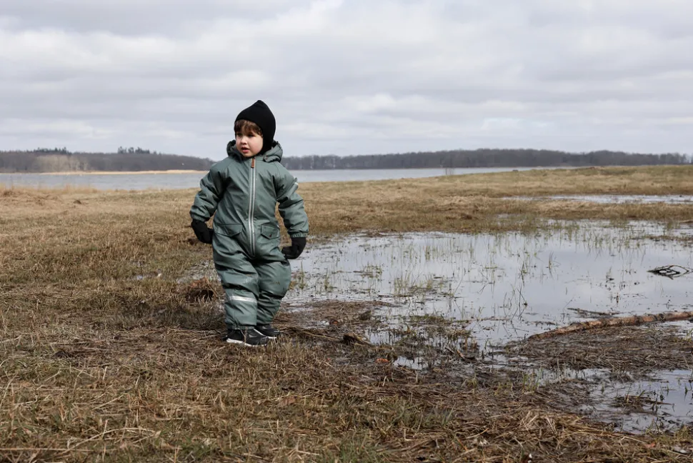 Den er nem at tage på/af, og beskytter barnet mod vand og vind med minimal begrænsning af barnets bevægelighed. Den har en fluorfri vand- og smudsafvisende overflade, så når legen er ovre, og dragten er dækket af mudder, kan du let rengøre den med en fugtig klud.