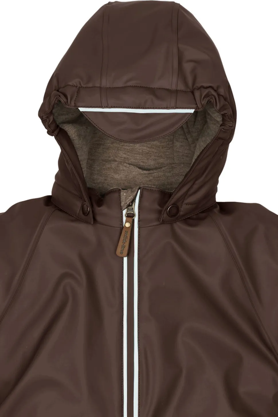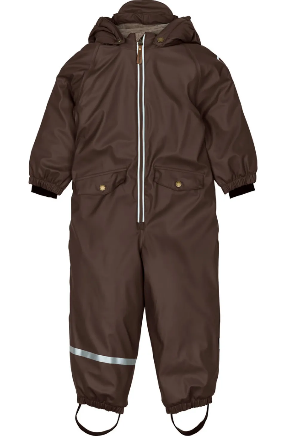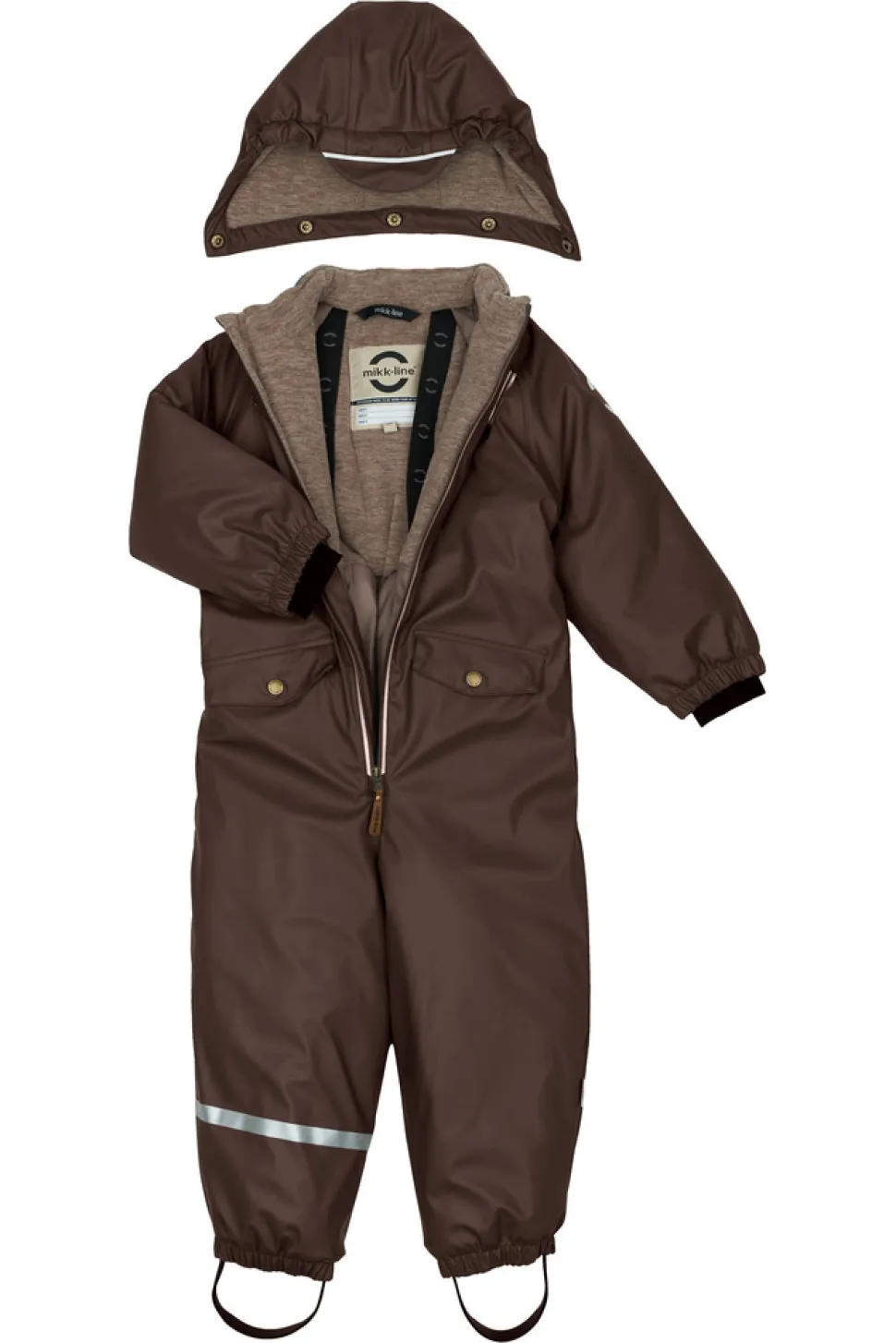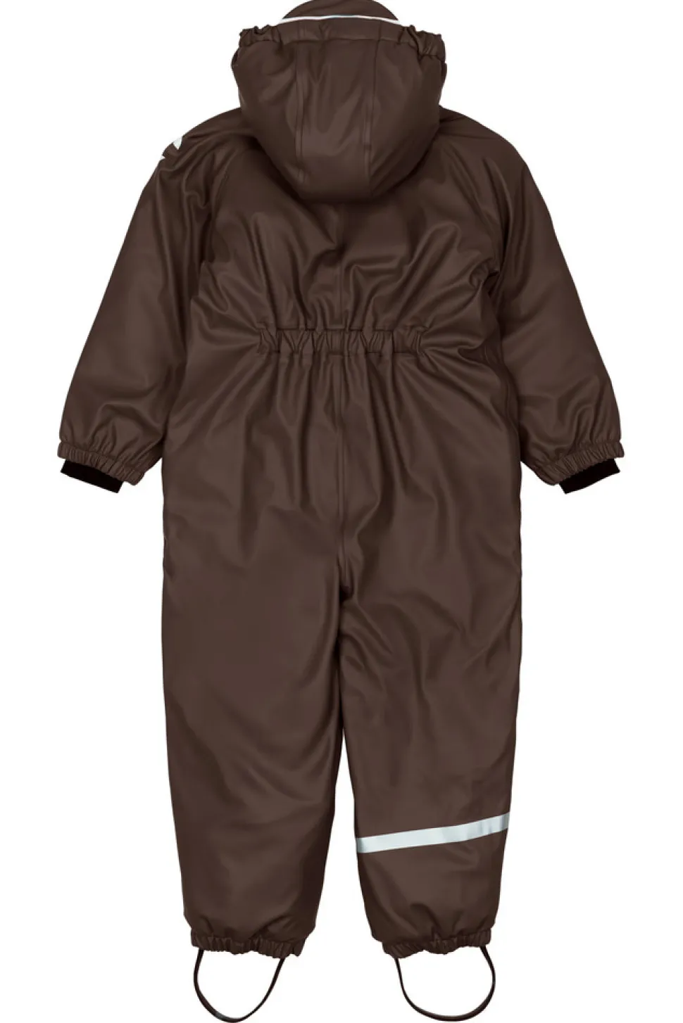 Denne praktiske dragt er lavet af 100% genanvendt polyester med blød polyurethan (PU) coating og polstret med polyesterfyld, så den holder barnet tør og varm. Overkroppen, hætten, kraven, og lommerne har ligeledes blødt fleece foer, hvorimod ærmerne og benene har en glat og gnidningsfri indvendig overflade.