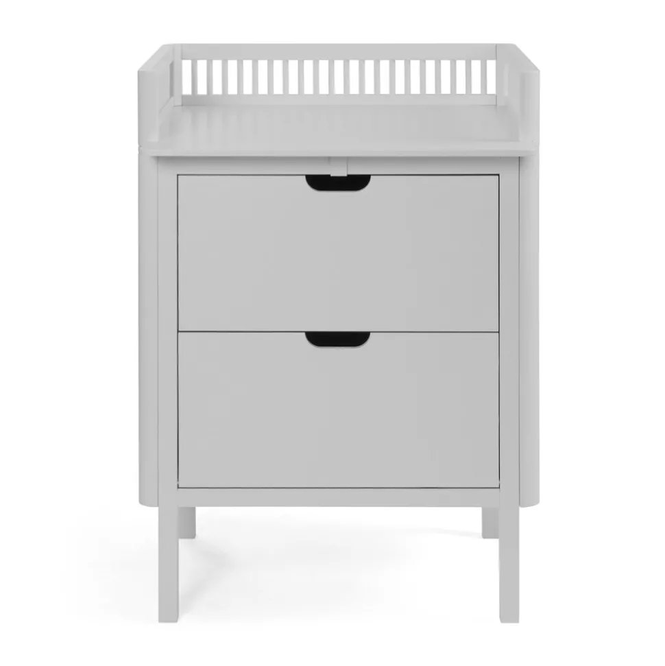 Sebra Puslebordet er et elegant, funktionelt og dansk-designet 2-i-1 møbel, som kommer med en kommode, en pusleplade og henholdsvis to skuffer. Puslebordet er designet med et skandinavisk og tidløst udtryk, der harmonerer med de øvrige møbler fra Sebra’s klassiske møbelkollektion. Et funktionelt, sikkert og klassisk puslebord uden uønsket kemi og med lang levetid til børneværelset, soveværelset, badeværelse eller et andet sted i hjemmet. Her ses Sebra Puslebordet med skuffer og i farven Classic White. Sebra Puslebordet med skuffer er et puslebord, der let kan forvandles til et klassisk opbevaringsmøbel, når behovet for puslebordet hører op. Puslepladen er lukket bagtil og til siderne og fremstår med en forhøjet kant med små runde tremmer, som er med til at give puslebordet det karakteristiske udtryk, som Sebra Sengen er så kendt og elsket for. Puslepladen (indvendige mål) har en dybde på 66 cm og en bredde på 69 cm, hvilket giver plads til en puslehynde og andre puslefornødenheder, som kræves i forbindelse med et bleskift, tøjskift eller blot en hyggestund med babypludder. De to skuffer giver mulighed for opbevaring at tøj, bleer, legetøj eller hvad der nu måtte være behov for. Skufferne er udstyret med ”softluk”, som sikrer, at skufferne lukkes stille og roligt. Derved minimeres risikoen for at få fingrene i klemme, og det er en god ting på netop børneværelset, hvor små fingre ikke altid er så hurtige, som de store. Den praktiske forvandling fra puslebord til opbevaringsmøbel sker ved, at puslepladen nemt fjernes fra underdelen. Denne egenskab gør, at det ikke er nødvendigt at opmagasinere et komplet puslebord eller skille sig af med puslebordet i perioden imellem blebørn – eller når behovet for et puslebord blot forsvinder helt. Det giver puslebordet en ekstra lang levetid og et produkt, der kan vokse med barnet eller dets søskende – et møbel, der let kan gå i arv. Fronterne fremstår med udskårne greb, der sammen med kommodens afrundede hjørner er med til at øge sikkerheden på børneværelset – ingen skarpe kanter, som kan give ridser og skrammer. Puslebordet er på fire ben, hvilket sikrer et lettere og mindre bastant udtryk end et puslebord uden ben. Det giver naturligvis også mulighed for opbevaring under kommoden, hvis behovet er der.