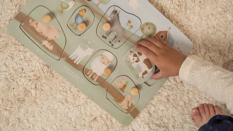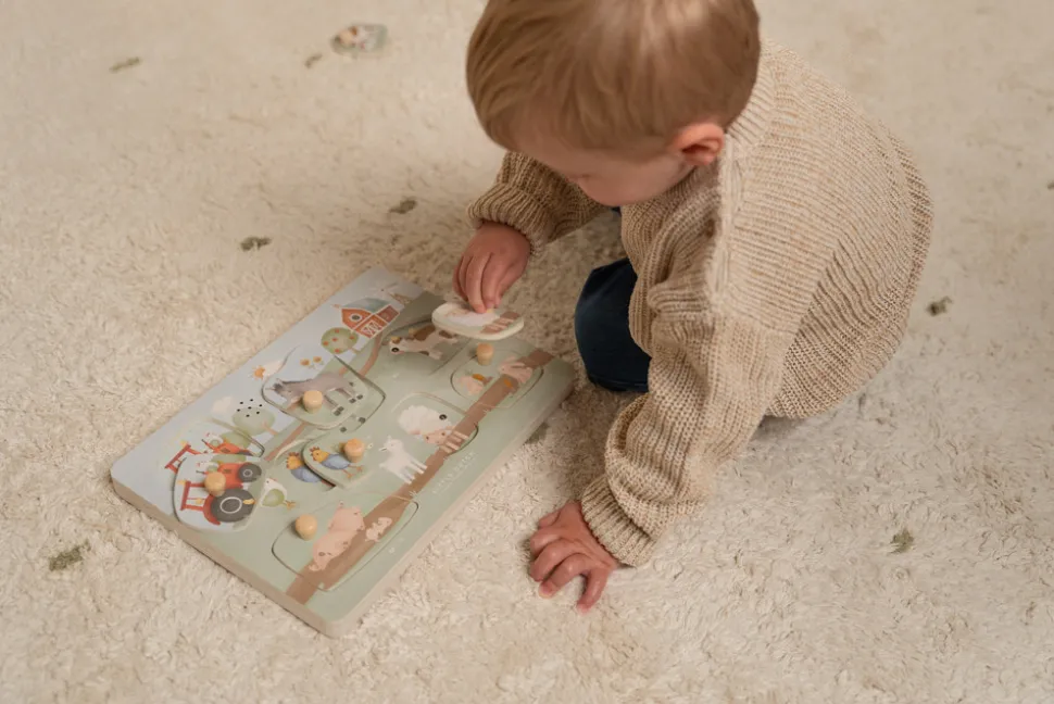Lær alle dyrene på bondegården at kende. Genkend deres former og unikke lyde med dette sjove puslespil. Når du placerer dyret tilbage på den rigtige plads, vil du høre en matchende lyd. Dette puslespil med 7 dyr og en lydgivende traktor fremmer øje-hånd-koordination og stimulerer dit barns ordforråd.Sensorerne reagerer, når puslespilsbrikken placeres tilbage. Puslespillet har lysaktiverede sensorer – brug det i godt lys for de bedste resultater. Sørg for, at knappen er “ON” for at aktivere lydfunktionen. Sensorerne kan utilsigtet aktiveres af direkte sollys, så sluk altid for dem, når de ikke er i brug. (Batterier (2 x AAA) medfølger ikke.)