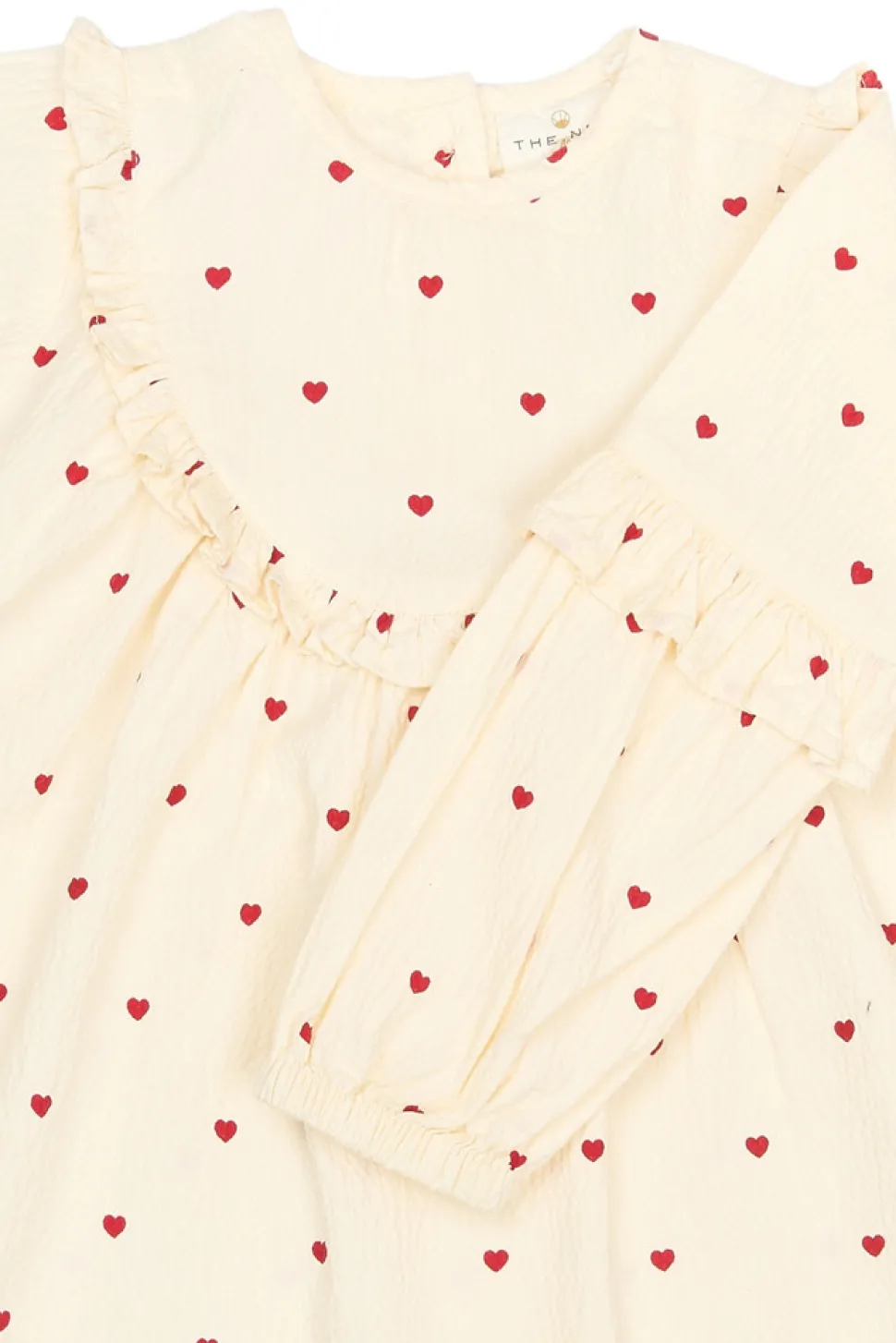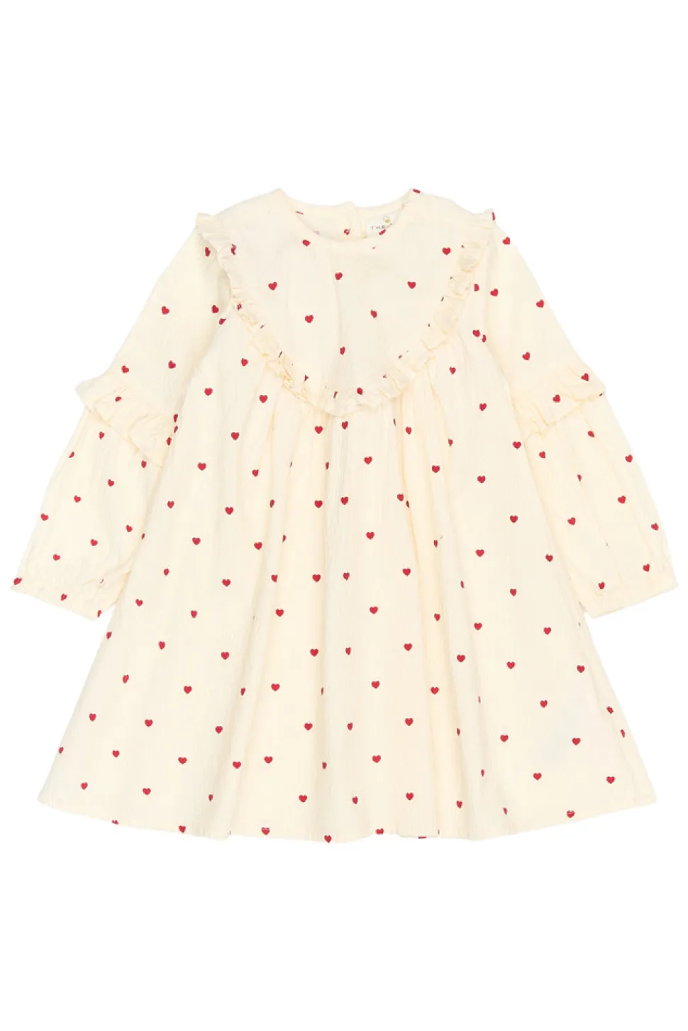 Denne kjole fra THE NEW Siblings er både romantisk og behagelig – perfekt til hyggelige og festlige lejligheder. Den har et sødt all-over hjerteprint og delikate flæsedetaljer langs brystet og ærmerne, hvilket tilføjer et feminint og legende touch. Kjolen har lange ærmer og en let A-form, der giver stor bevægelsesfrihed og en blød silhuet.