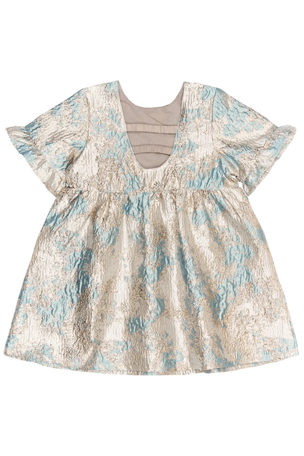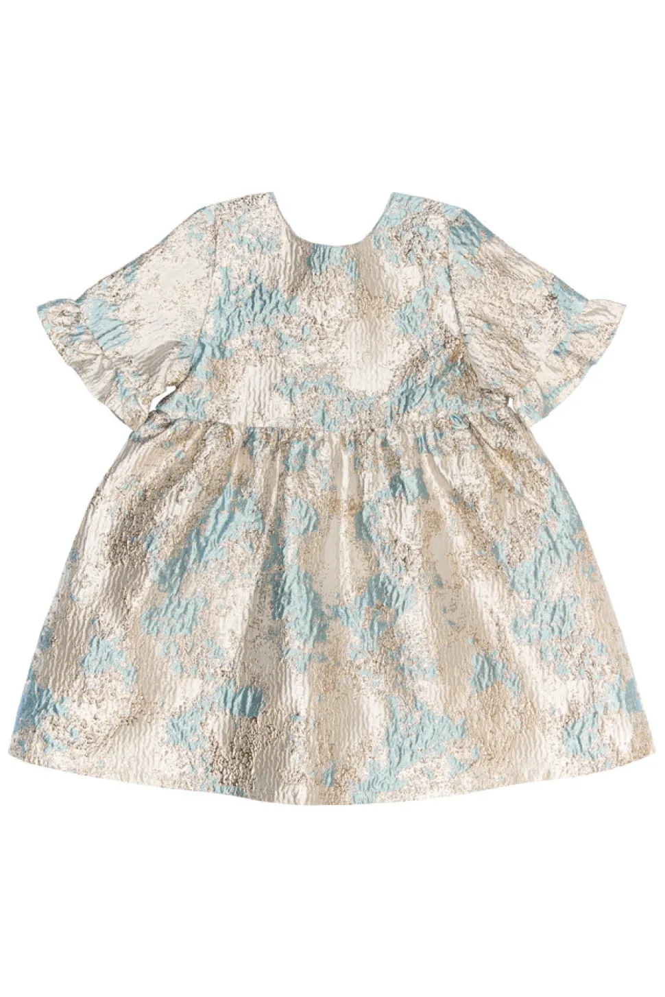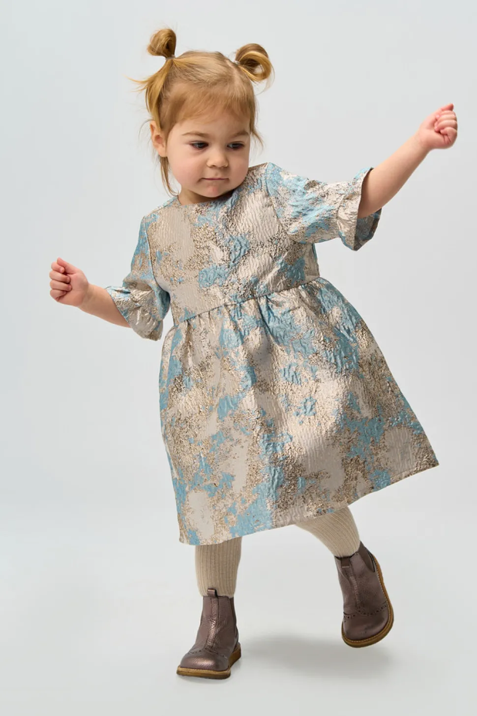 Denne kjole fra THE NEW Siblings er et virkelig elegant stykke, perfekt til specielle lejligheder. Fremstillet af et smukt jacquardstof med et glitrende blomstermønster, den har en blusset silhuet med blød volumen og flagrende ærmer, der tilføjer et raffineret og festligt præg. Kjolen er både stilfuld og behagelig, så de små kan skinne og lege, mens de stadig kan stråle frit.