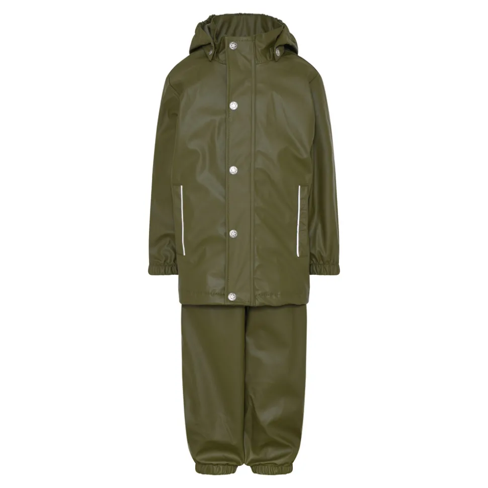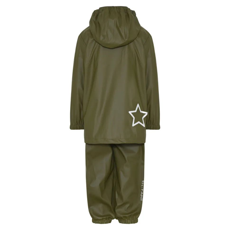 Regntøj i vind- og vandtæt funktionsmateriale fra EN FANT. Sættet har svejsede sømme. Jakken har aftagelig hætte med trykknapper og i øvrigt YKK lynlås i front. Elastisk, justerbar talje samt elastik ved ærmer. Bukserne har elastik forneden på benene og forstærket justerbar elastik under foden. Str. 86-104 har elastiske, justerbare seler med spænder i plast. Str. 110-140 er uden seler og har elastik omkring taljen. 3M reflekterende detaljer. Uden for. PU gummibelagt materiale uden miljøfarlige fluorcarboner. Vandfast: 5.000 mm.